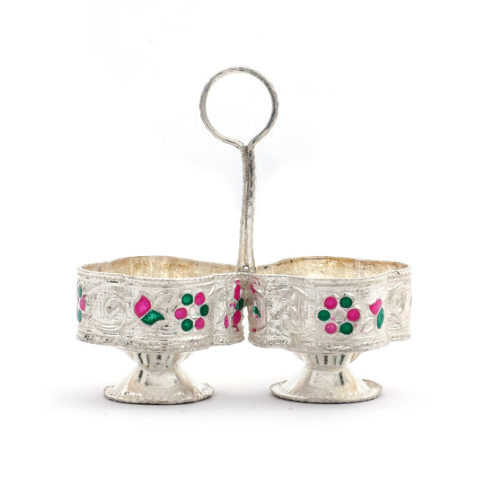 Meenakari Silver Kankavati – Dual Bowl Holder with Floral Enamel Work
