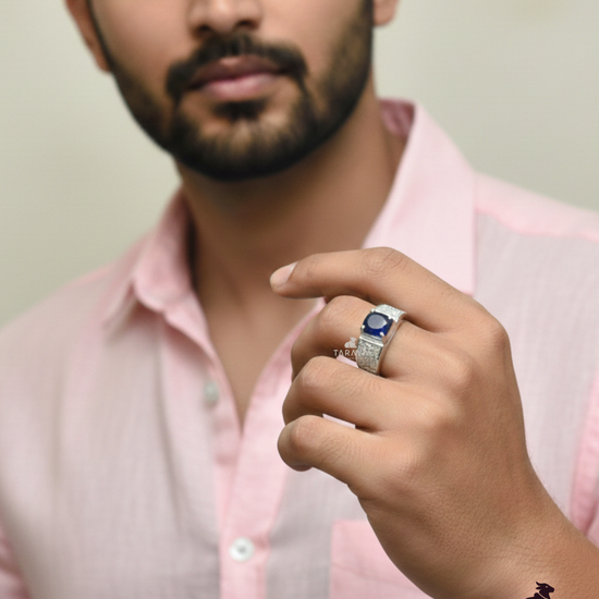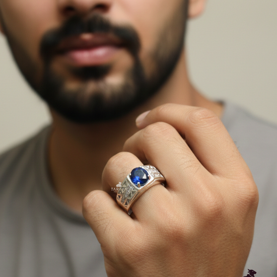 Designed for men who like subtle luxury, this ring balances a striking blue centerpiece with elegant side patterns. The gemstone adds a regal touch, while the solid silver body ensures durability and long-term wear..