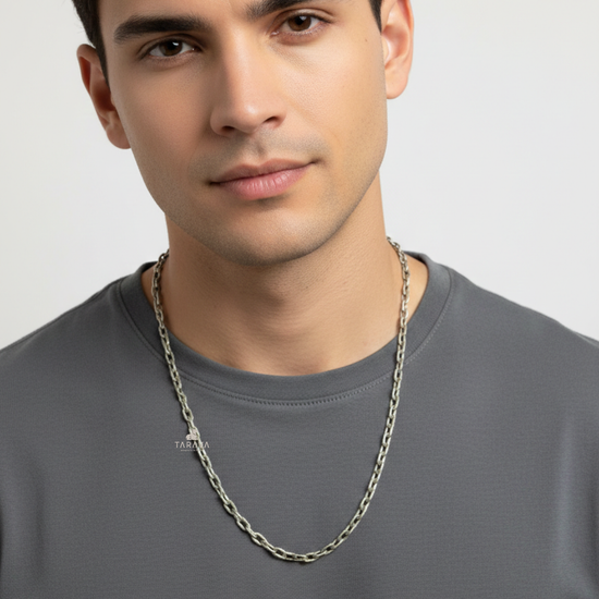 This Tarava men’s silver chain showcases a bold yet timeless design, making it a versatile essential for every man’s jewellery collection. The solid link structure gives it a masculine presence while remaining comfortable and lightweight for everyday wear.
