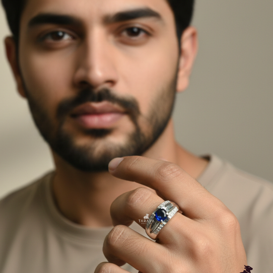 This ring stands out with its layered band design and vibrant blue gemstone. The CZ detailing adds sparkle without overpowering the look, making it stylish yet masculine.