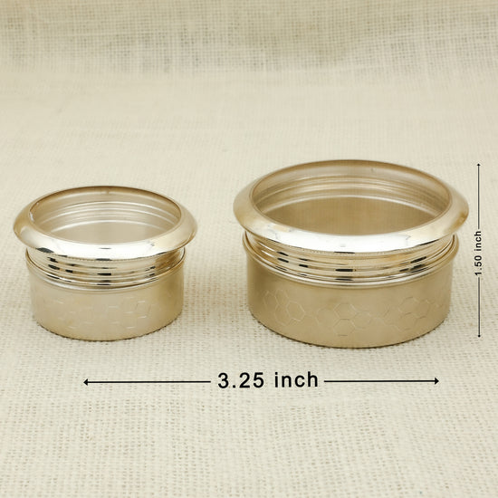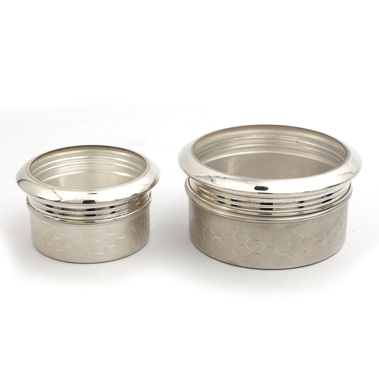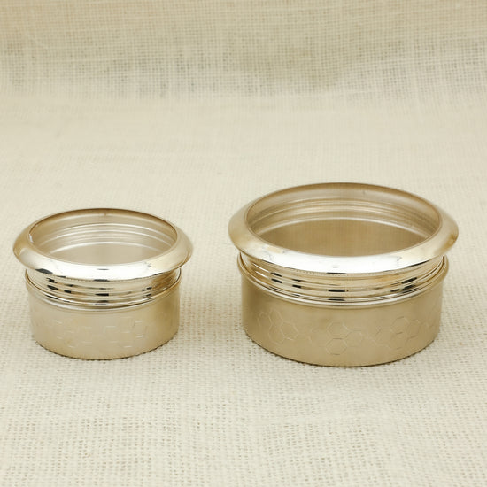 Add a regal touch to your décor with this exquisitely crafted glass jar, adorned with antique silver detailing. The intricately engraved floral band and ribbed silver lid elevate its elegance, making it a perfect blend of utility and art. Ideal for storing dry offerings, spices, or simply as a decorative accent on festive occasions. A thoughtful and elegant gift for housewarmings, traditional ceremonies, or collector displays.