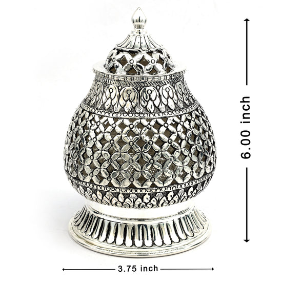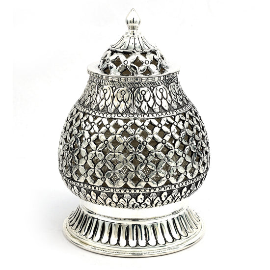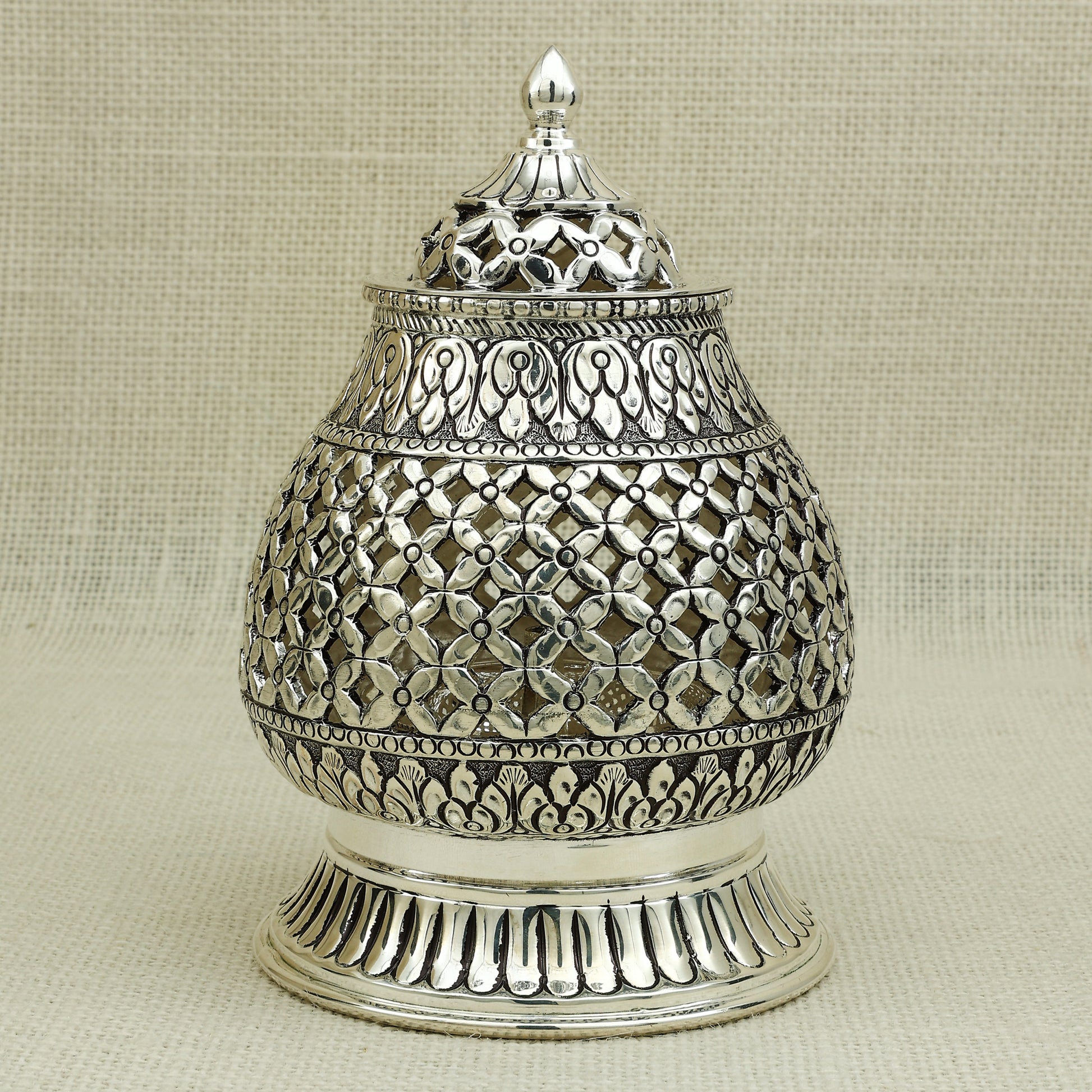 Illuminate your sacred space with this exquisitely handcrafted Silver Akhand Deepak, featuring intricate filigree work and a timeless antique design. Designed to radiate divine energy, this eternal lamp symbolizes purity, faith, and prosperity. Its perforated craftsmanship allows the light to shine beautifully, creating a serene ambiance during prayers and rituals. Ideal for temples, homes, and festive ceremonies, this Akhand Deepak makes a meaningful gift for religious occasions, housewarmings, and spiritual seekers. Bring home this symbol of divine illumination and enrich your devotional practices.