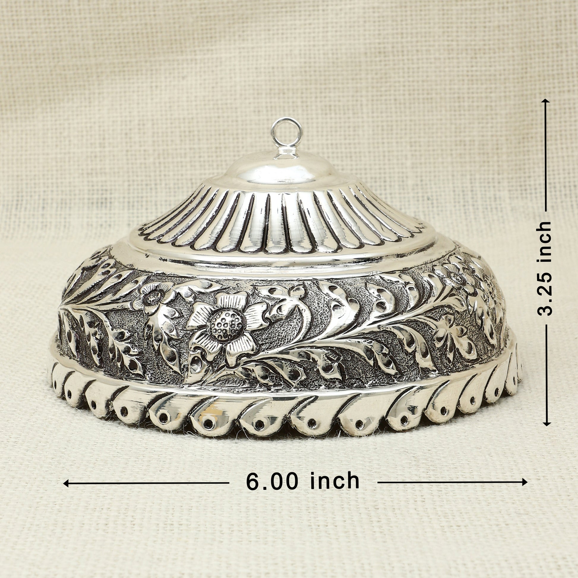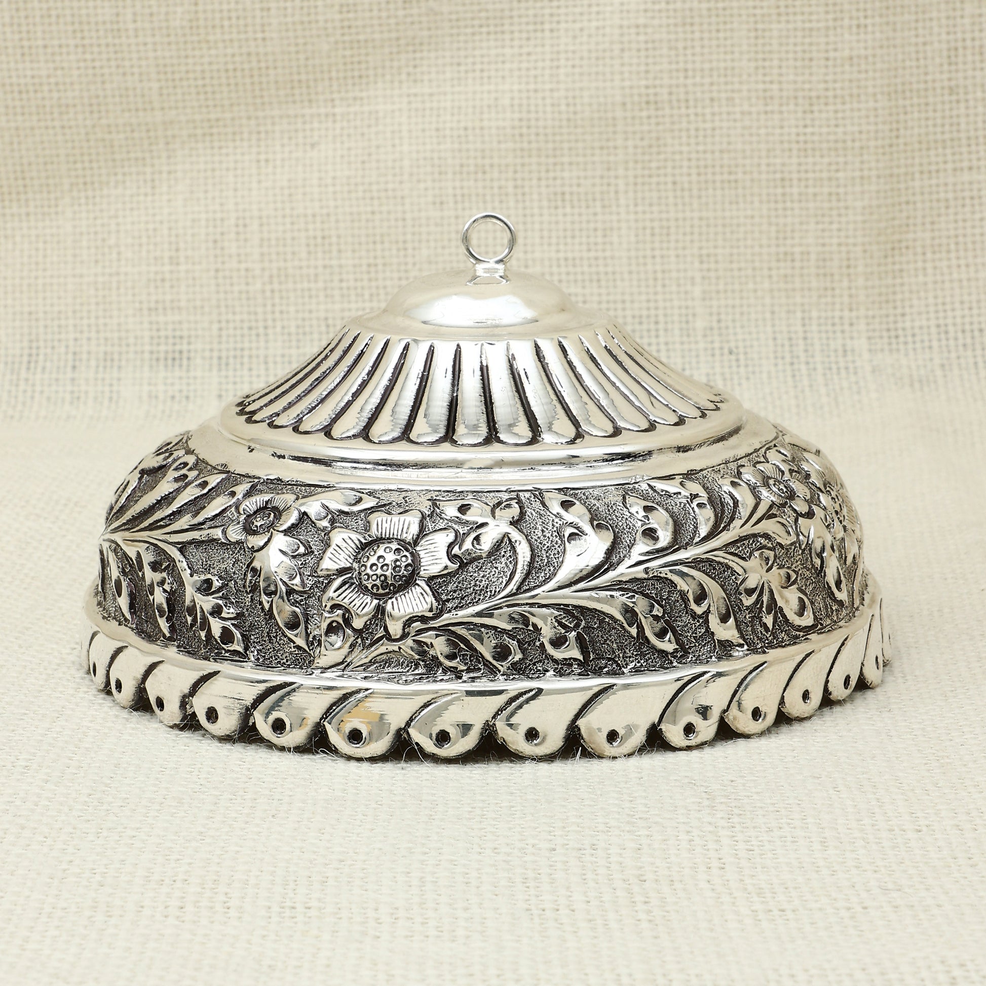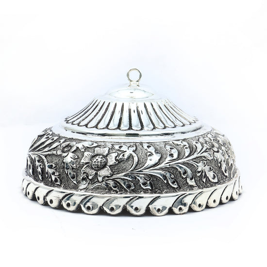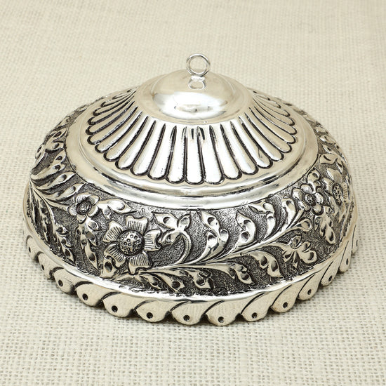 This handcrafted silver dome box is a testament to exquisite artistry, featuring intricate floral engravings and a gracefully contoured lid with a loop handle. Designed with traditional motifs and elegant detailing, the box serves as a refined container for storing kumkum, dry fruits, or cherished keepsakes. The bold border work and ornate craftsmanship elevate its charm, making it an ideal addition to your pooja décor or as a distinguished gift for festive occasions. A timeless blend of functionality and ornamental beauty, perfect for those who appreciate cultural elegance.