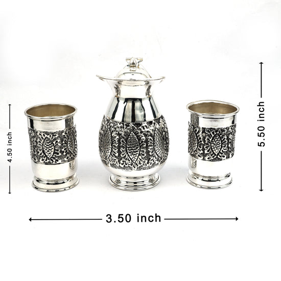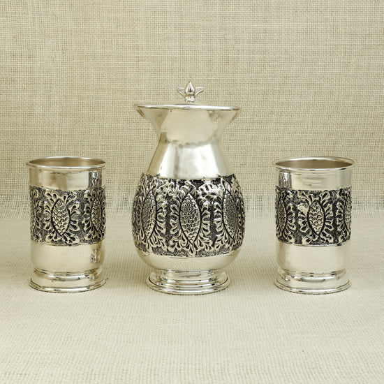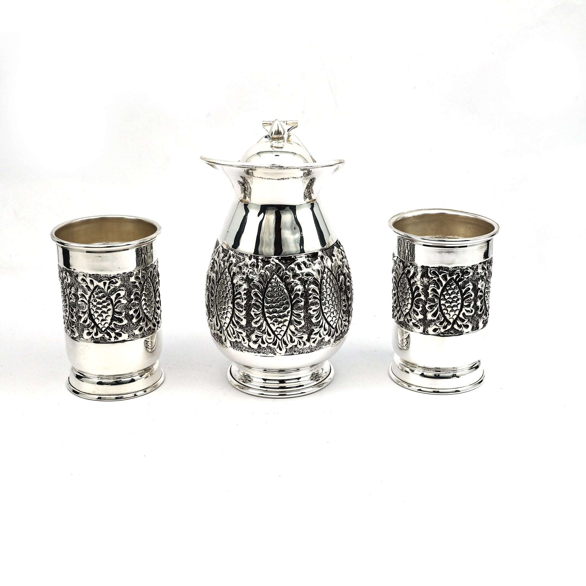Elevate your dining experience with this stunning silver jug and glass set, featuring intricate floral engravings. The beautifully handcrafted design adds a touch of vintage charm, making it perfect for serving water, juice, or traditional beverages. Ideal for gifting on special occasions like weddings, anniversaries, or housewarming celebrations, this elegant set is a timeless addition to any home.