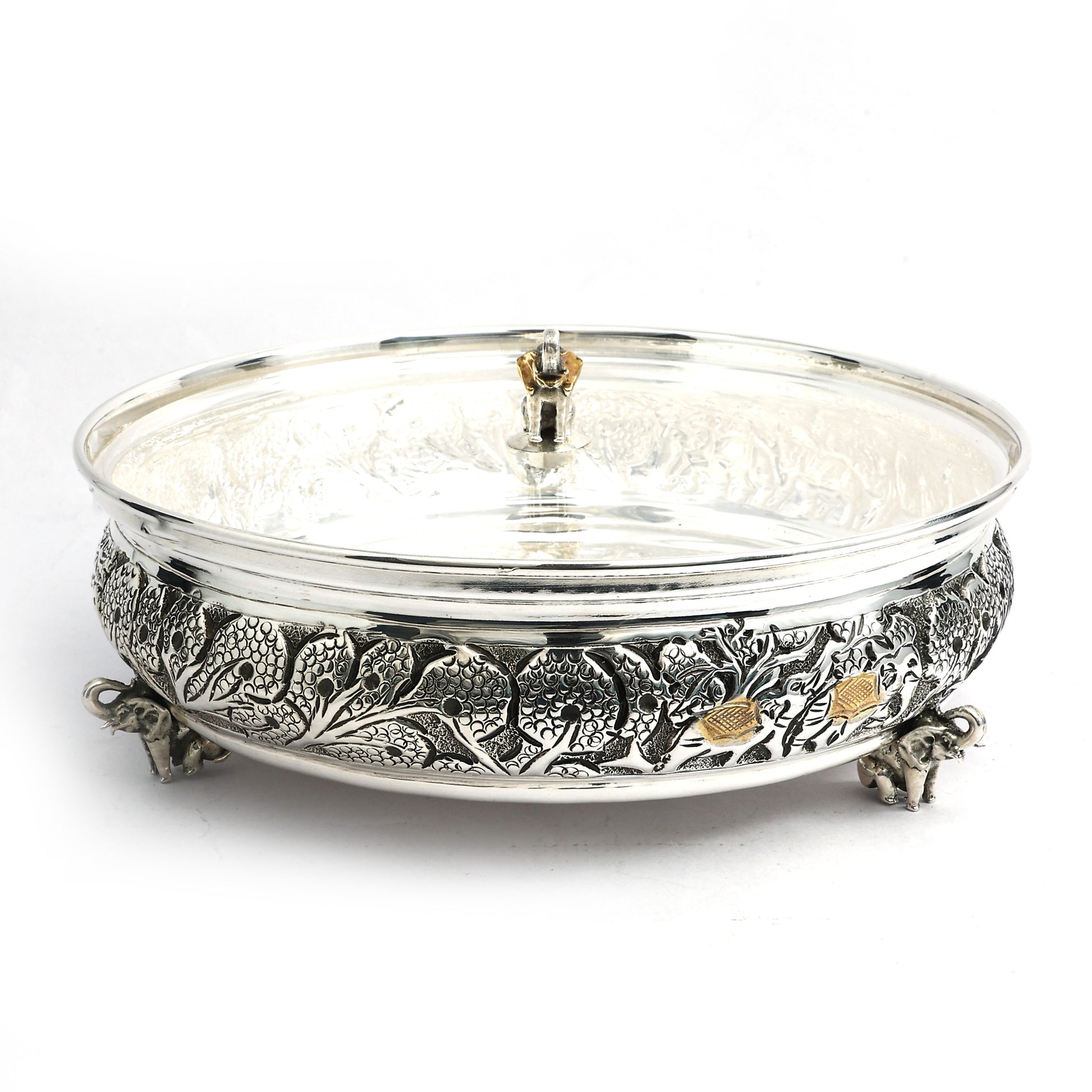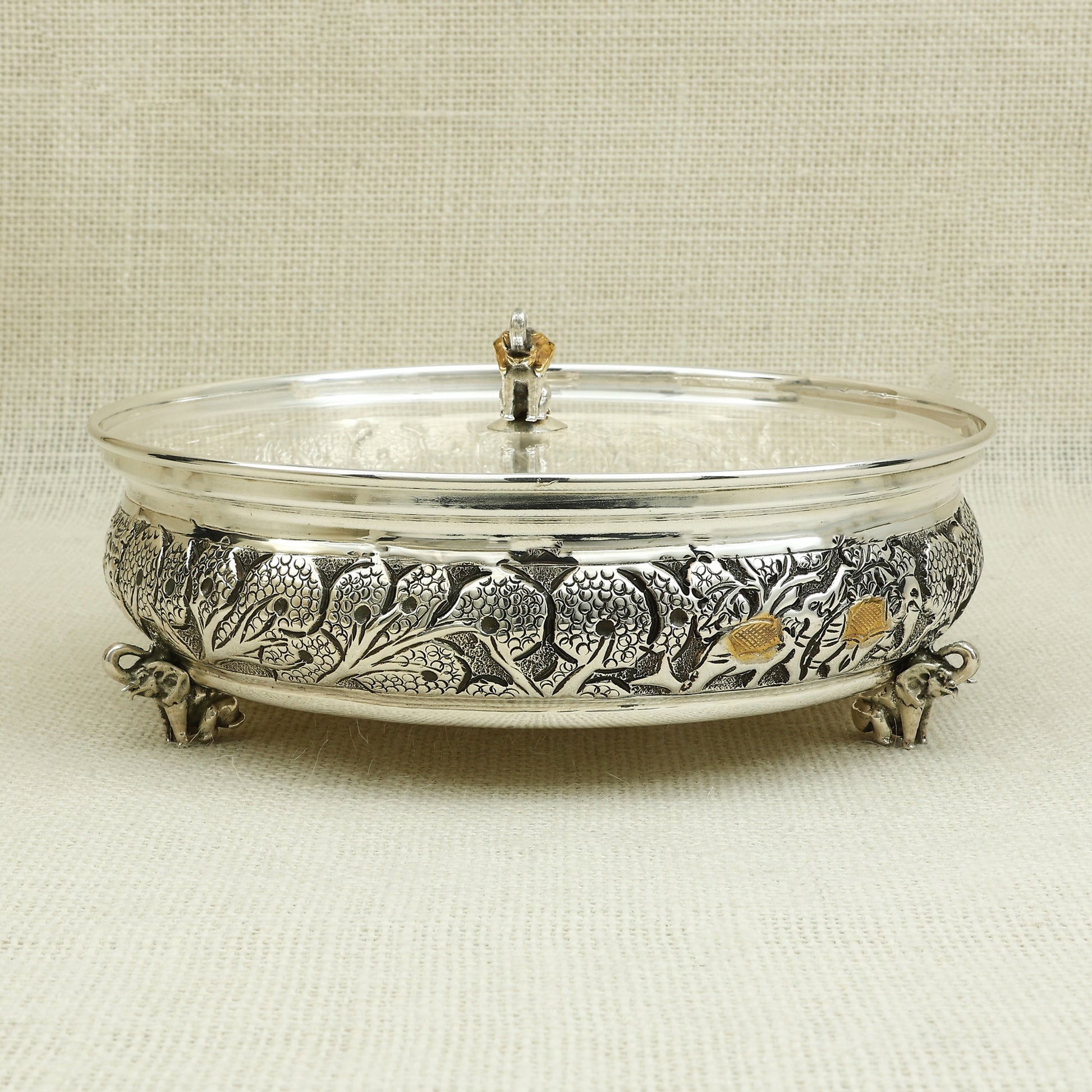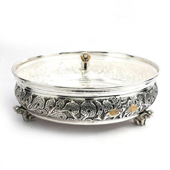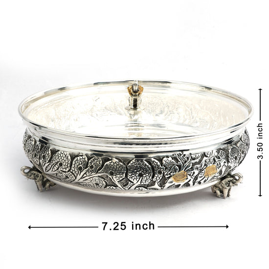 Elevate your serving experience with this exquisite silver Kachola, adorned with intricate floral engravings and subtle gold-tone details. This handcrafted masterpiece sits elegantly on sculpted legs, blending functionality with timeless charm. The transparent lid preserves freshness while showcasing the contents, making it perfect for serving sweets, dry fruits, or festive delicacies. An ideal addition to traditional homes and a thoughtful gift for weddings, anniversaries, and special occasions, this silver Kachola is a true symbol of heritage and elegance.