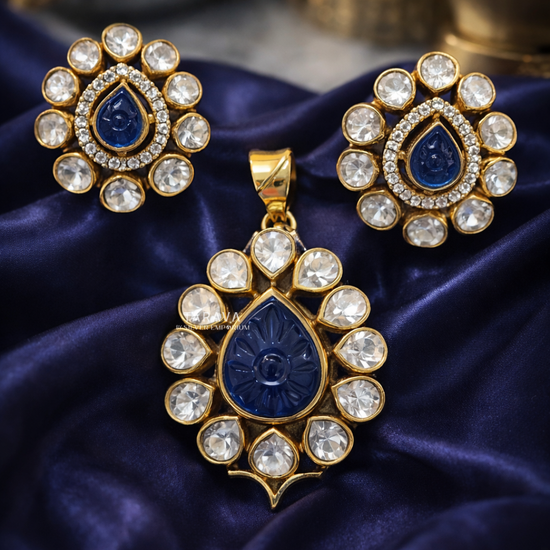 A striking silver polki set featuring a carved royal blue teardrop stone at the center, surrounded by a halo of shimmering polki stones. The pendant is beautifully balanced with matching circular stud earrings carrying the same carved detailing, adding a majestic traditional feel.