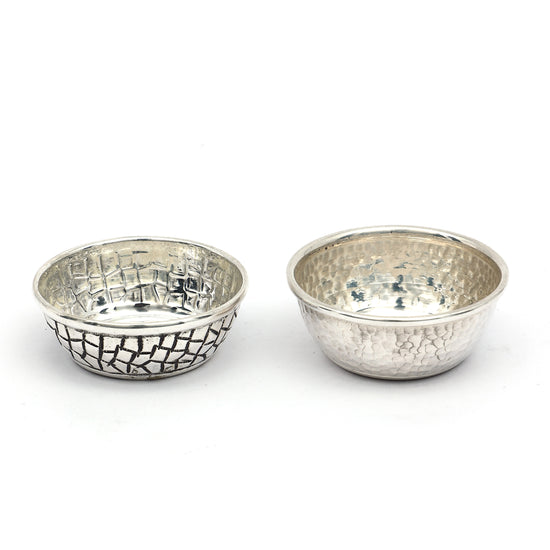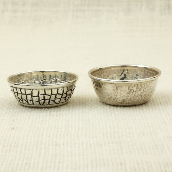 A refined pairing of two handcrafted silver katoris, each with its own distinct artistry. One features a striking lattice-like engraving with a dark antique finish, while the other showcases a classic hammered texture that glistens with subtle sophistication. These versatile bowls are ideal for pooja rituals, gifting, or serving dry fruits and sweets with a touch of heritage. Their compact form and intricate detailing make them elegant additions to any silverware collection.
