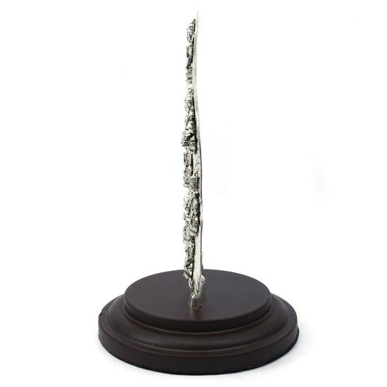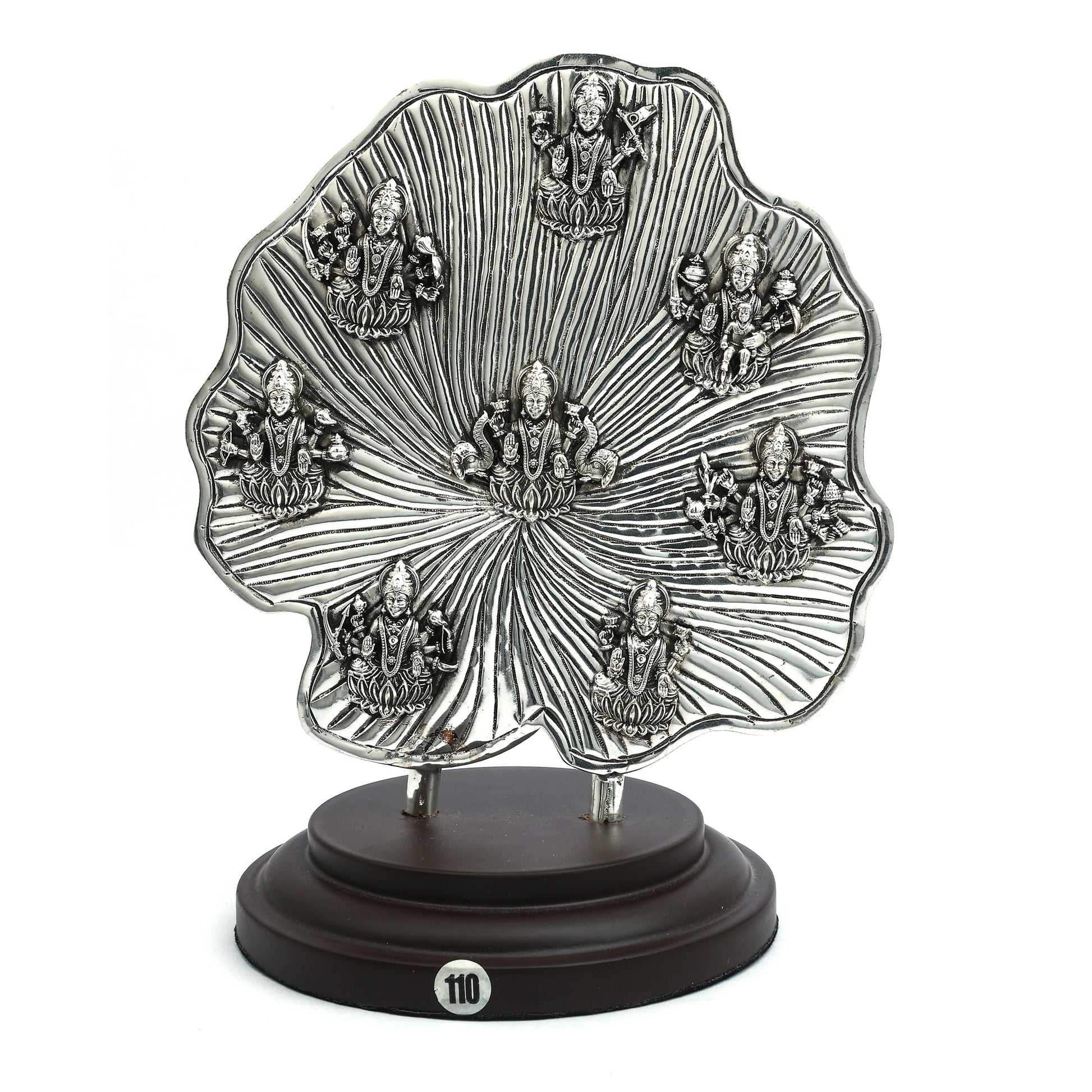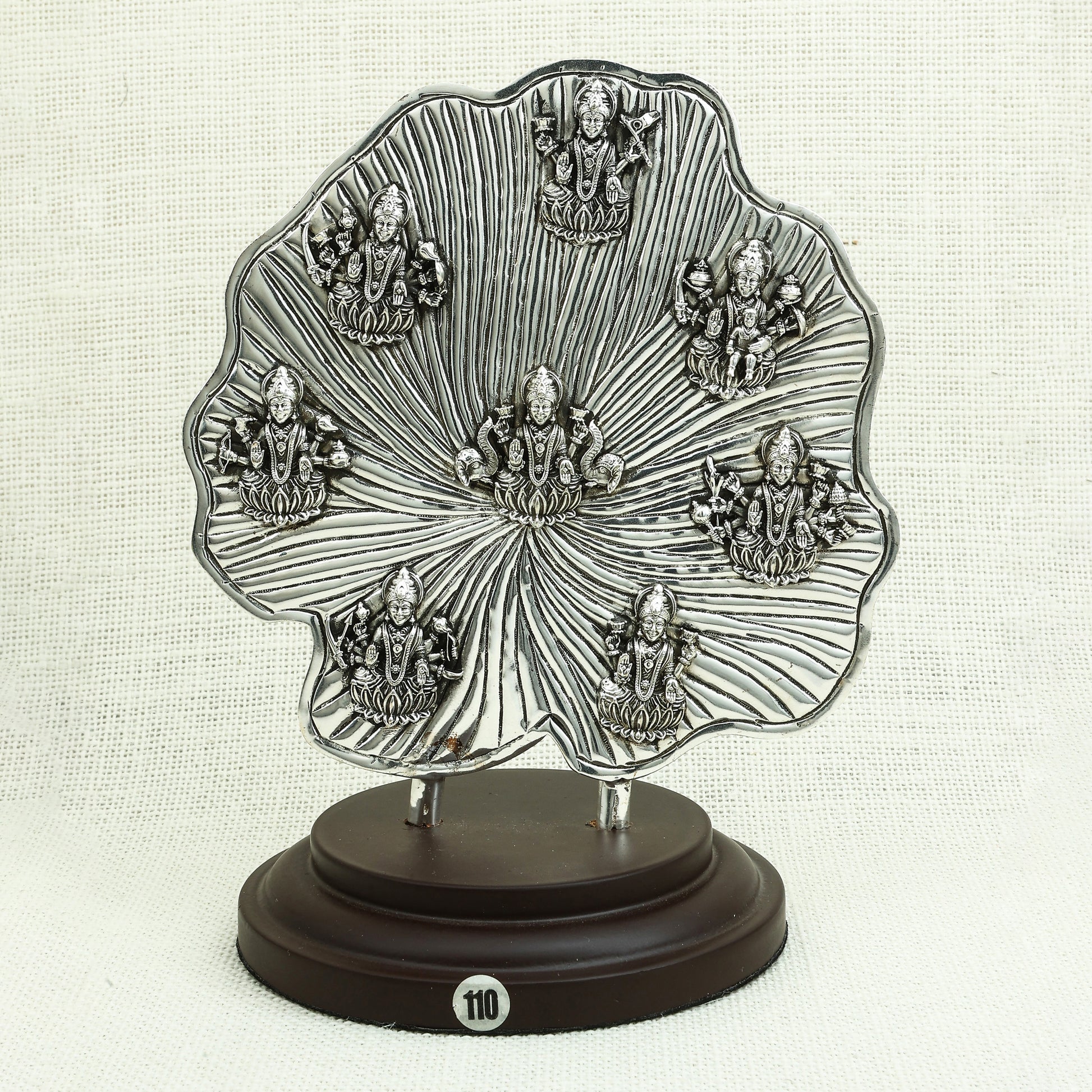 This stunning Asthalaxmi idol features eight intricately detailed representations of Goddess Lakshmi arranged on a beautifully textured silver leaf. Crafted with precision, this masterpiece symbolizes prosperity, wealth, and divine blessings. Set on a sturdy wooden base, it makes a perfect addition to home temples, festive decor, or a meaningful gift for spiritual occasions.