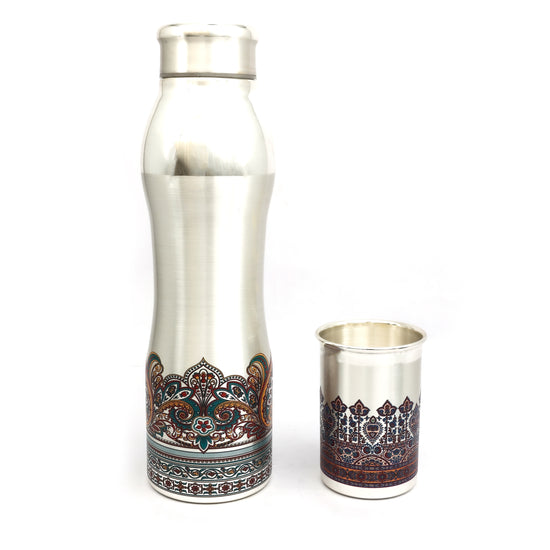 Add a royal touch to your daily hydration ritual with this beautifully crafted pure silver bottle and glass set, adorned with intricate Meenakari enamel work. The elegant design showcases traditional Indian craftsmanship, making it not just a utility item but a collectible masterpiece. Perfect for pooja rituals, festive gifting, or simply elevating your dining aesthetics, this set is a symbol of luxury and cultural pride.