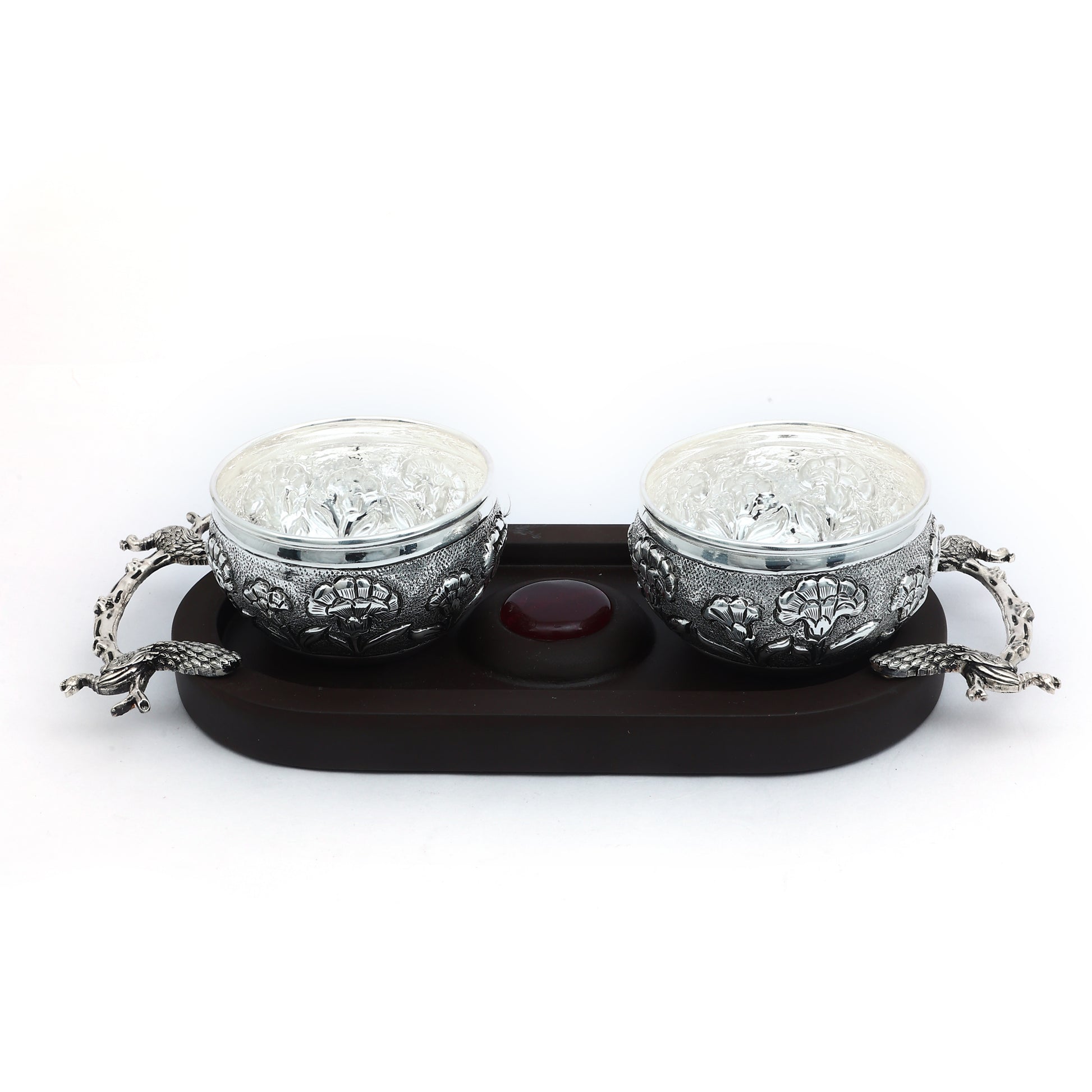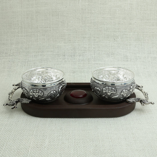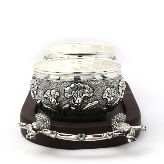 This luxurious pure silver bowl set features intricate floral engravings and striking dragon-shaped handles, symbolizing strength and prosperity. The finely crafted bowls rest on an elegant wooden base with a central decorative element, making it a perfect blend of tradition and artistry. Ideal for serving dry fruits, sweets, or as a statement gift, this set adds a touch of regal charm to any occasion.