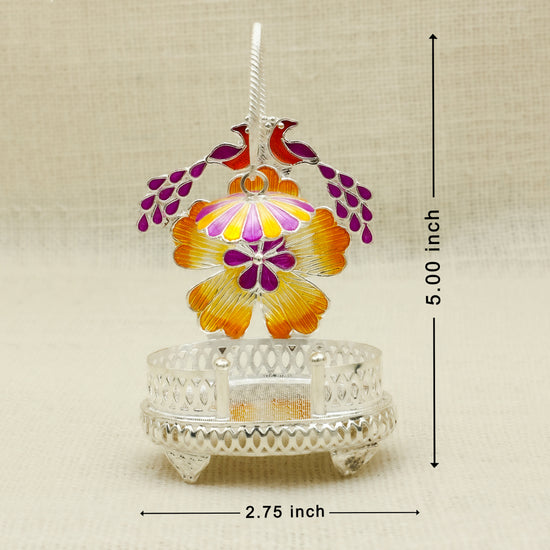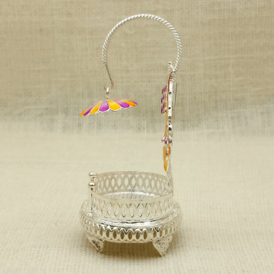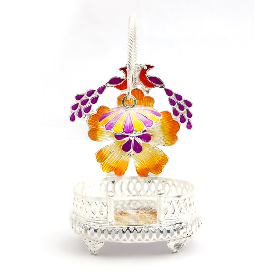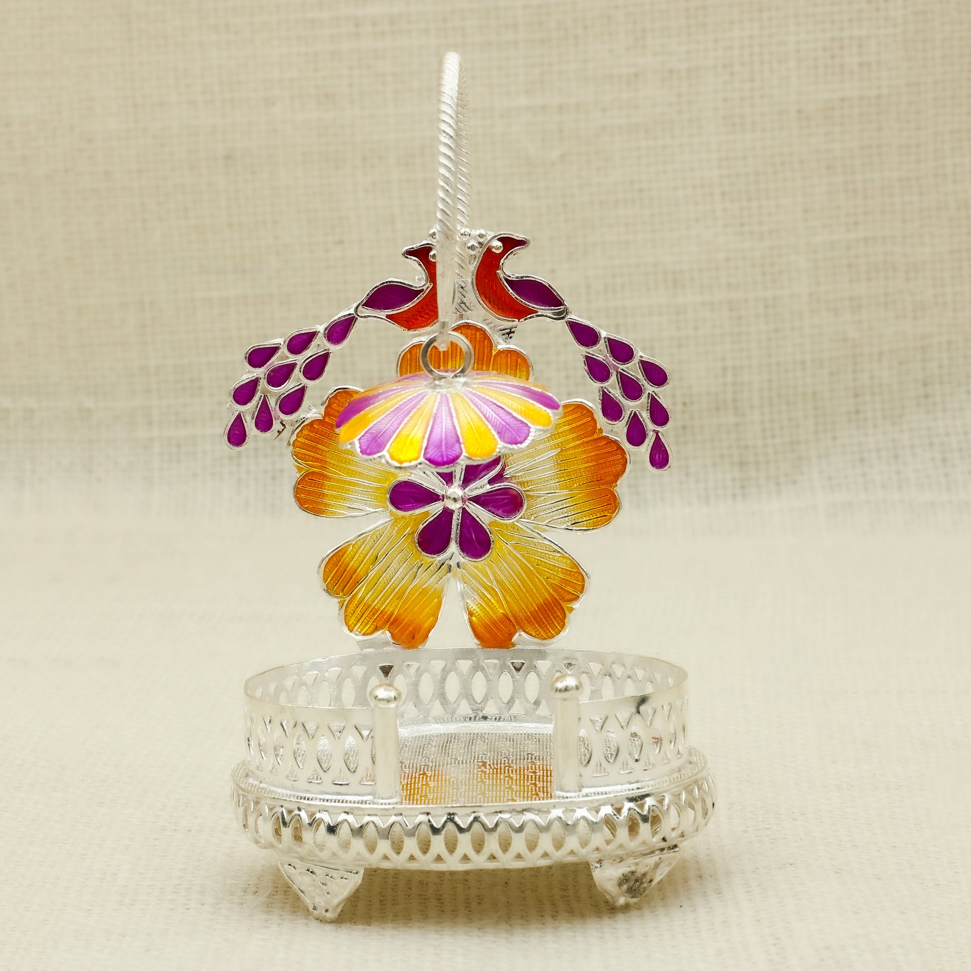 Add a splash of vibrant tradition to your décor with this charming Silver-Plated Jhula, featuring intricate meenakari work in radiant hues of orange, purple, and red. Designed with floral motifs and twin birds perched atop, this handcrafted miniature swing is a delightful piece for festivals, home temples, or gifting. The beautifully detailed base and the colorful enamel accents reflect fine craftsmanship and cultural elegance. Perfect for placing small idols or as a standalone decorative item, this jhula brings joy, color, and artistry into any space.