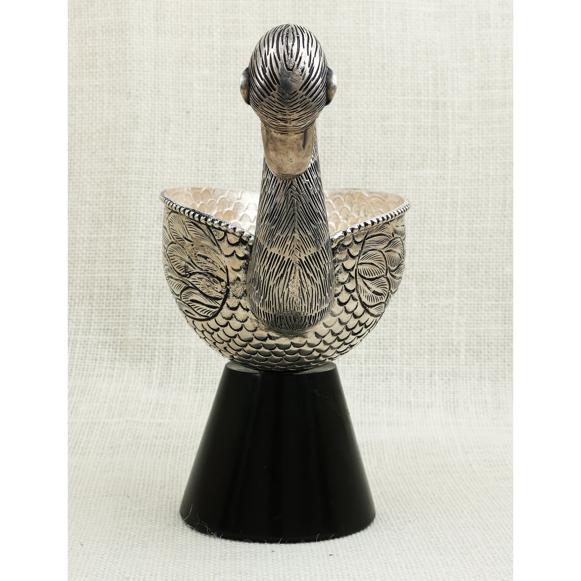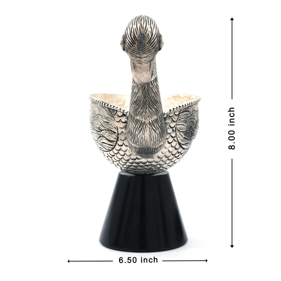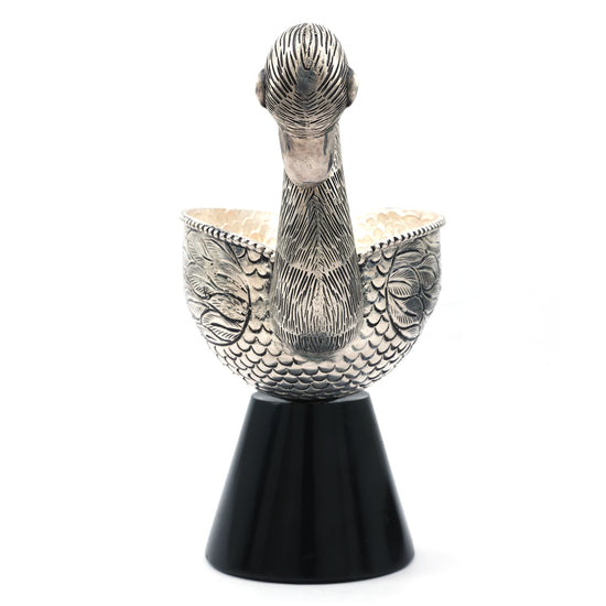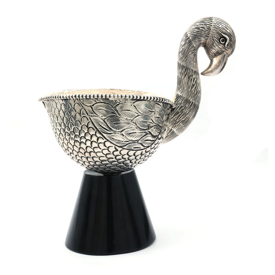 A stunning blend of elegance and craftsmanship, this silver duck goblet is a true statement piece. The bowl features intricate feather engravings, complemented by a gracefully curved duck head, adding a regal touch to its design. Resting on a sleek black base, this goblet is perfect for ceremonial use, luxury gifting, or as a unique décor piece. A timeless treasure that embodies sophistication and artistic finesse.