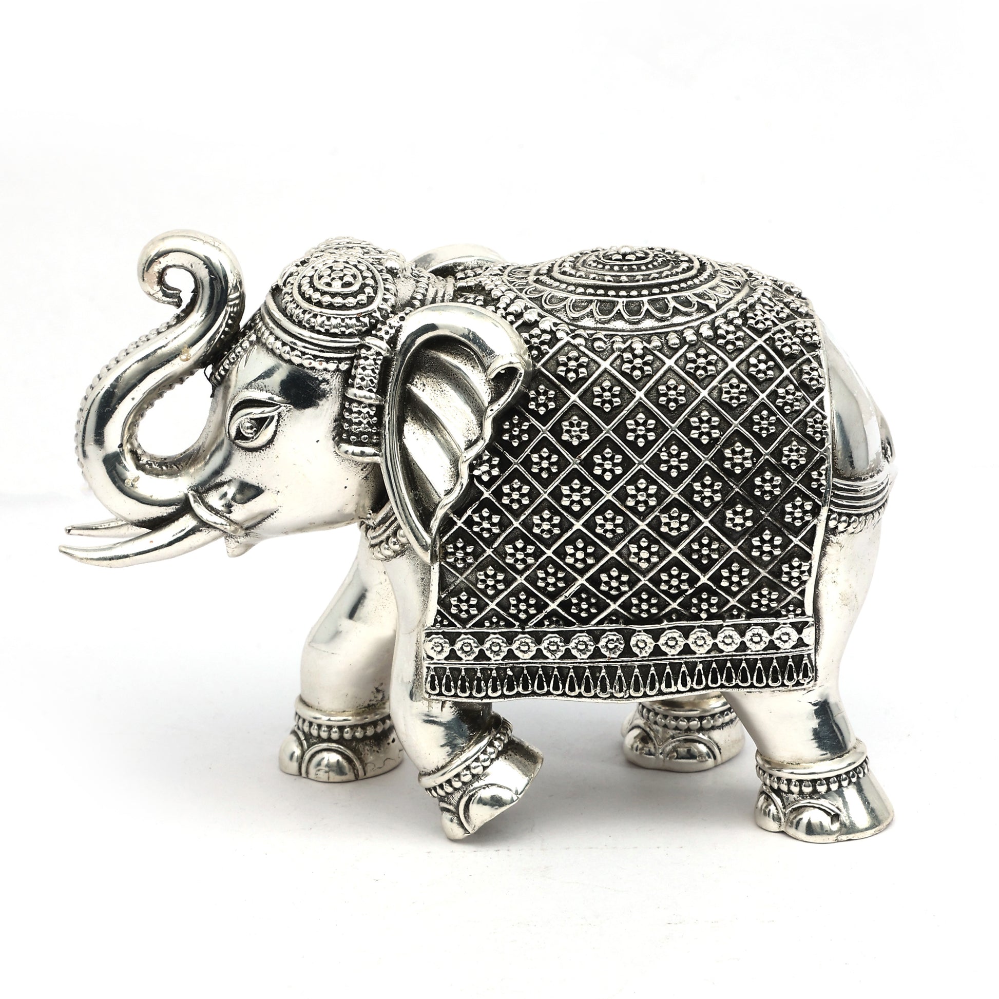 Exuding grandeur and tradition, this silver elephant figurine is a masterpiece of fine craftsmanship. Adorned with intricate engravings, the majestic elephant showcases a beautifully patterned saddle, ornamental headpiece, and lifelike detailing. A symbol of wisdom, prosperity, and strength, this piece makes a perfect addition to your home décor, gifting collection, or sacred space. Elevate your interiors with this timeless work of art.