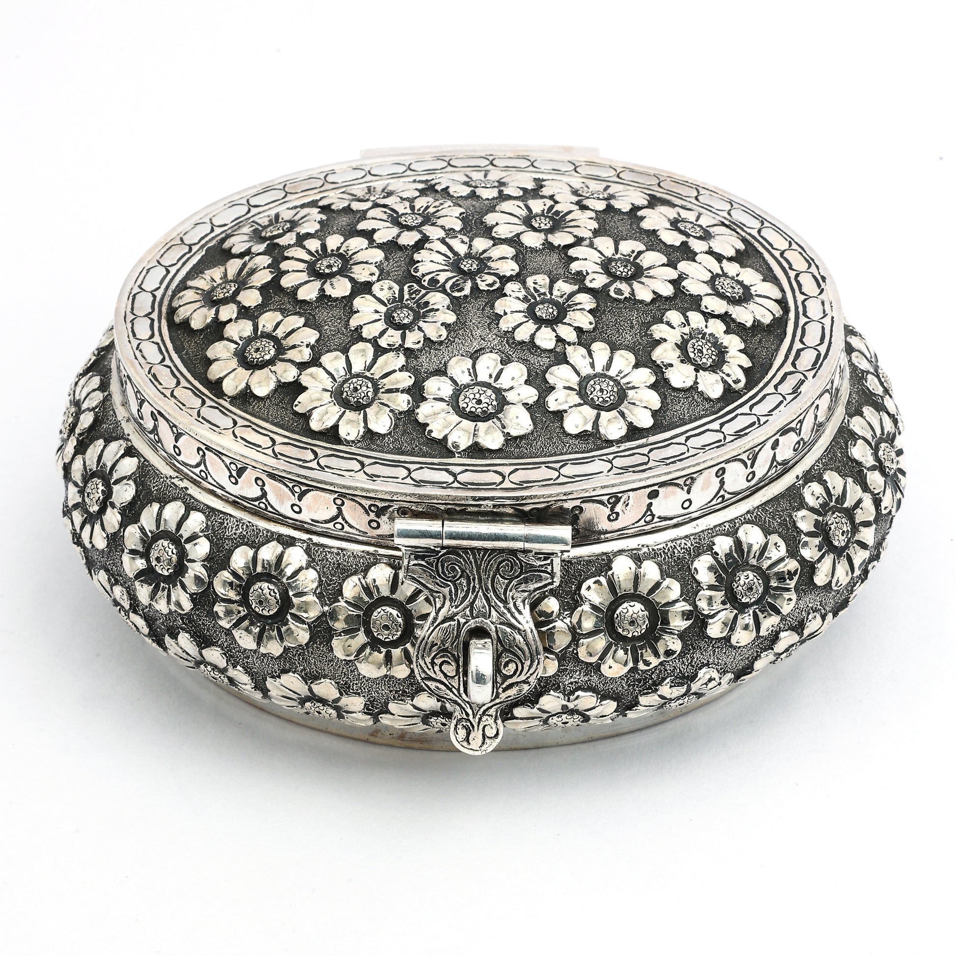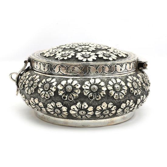 This beautifully handcrafted pure silver dry fruit box features intricate floral engravings, symbolizing elegance and tradition. Designed with a secure lock, it ensures the safe storage of dry fruits, sweets, or precious items while enhancing its regal charm. A perfect blend of artistry and functionality, this luxurious box makes an exquisite gift for weddings, festivals, and special occasions.