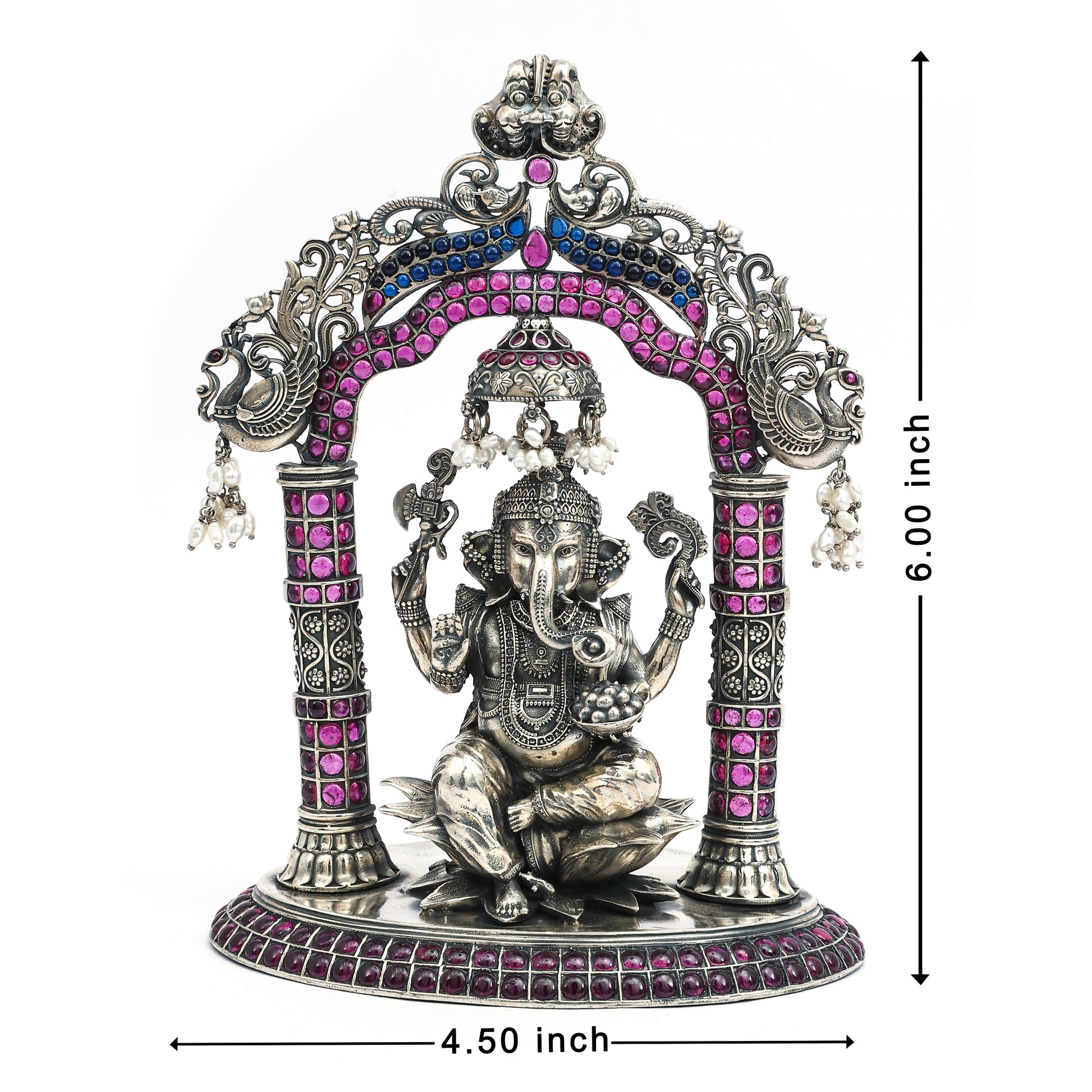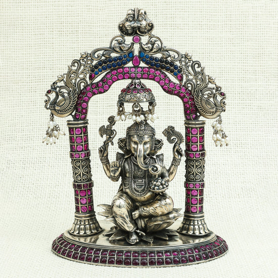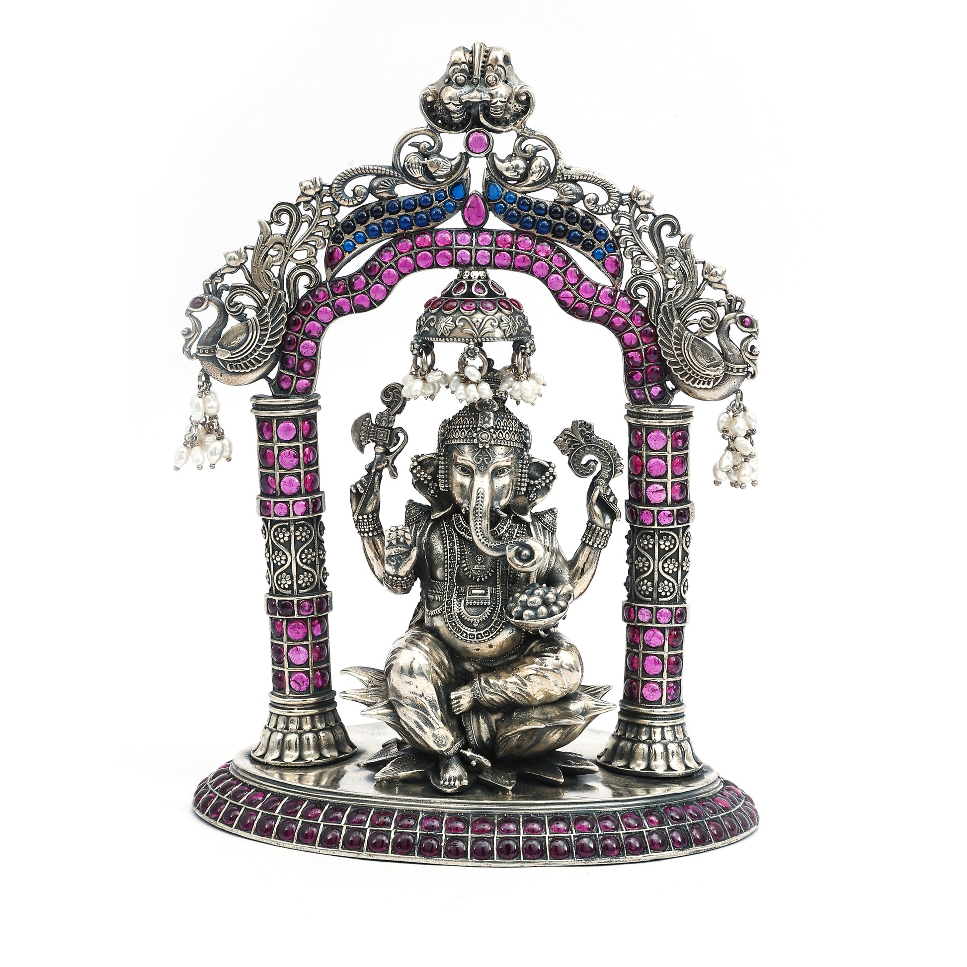 A magnificent silver Ganesha idol seated gracefully beneath a beautifully adorned arch. This intricately handcrafted piece features fine detailing, embellished with vibrant pink and blue stones, along with delicate pearl hangings. The divine presence of Lord Ganesha symbolizes wisdom, prosperity, and good fortune. A perfect addition to pooja rooms, home decor, or as an auspicious gift for weddings and festive occasions.