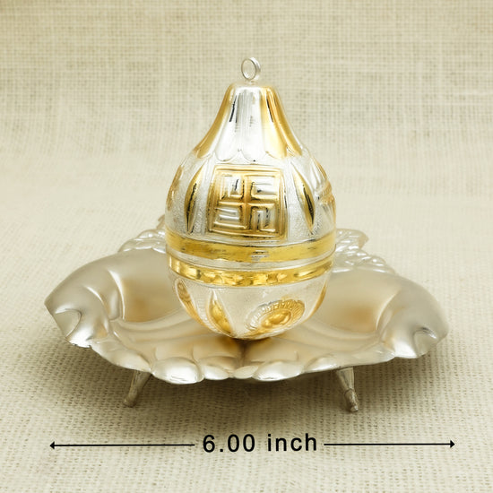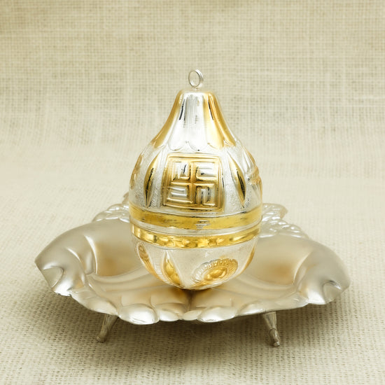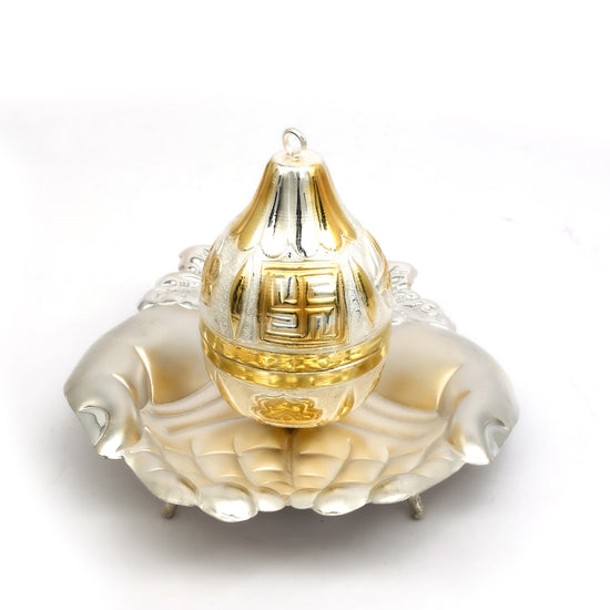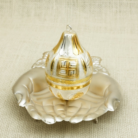 Add a sacred touch to your rituals with this intricately crafted decorative Nariyal, in radiant silver and gold tones. Featuring embossed traditional symbols and placed on a beautifully designed hand-shaped tray, this piece symbolizes purity and prosperity. Ideal for wedding ceremonies, housewarmings, and festive pooja setups, it’s a timeless representation of devotion and Indian tradition.