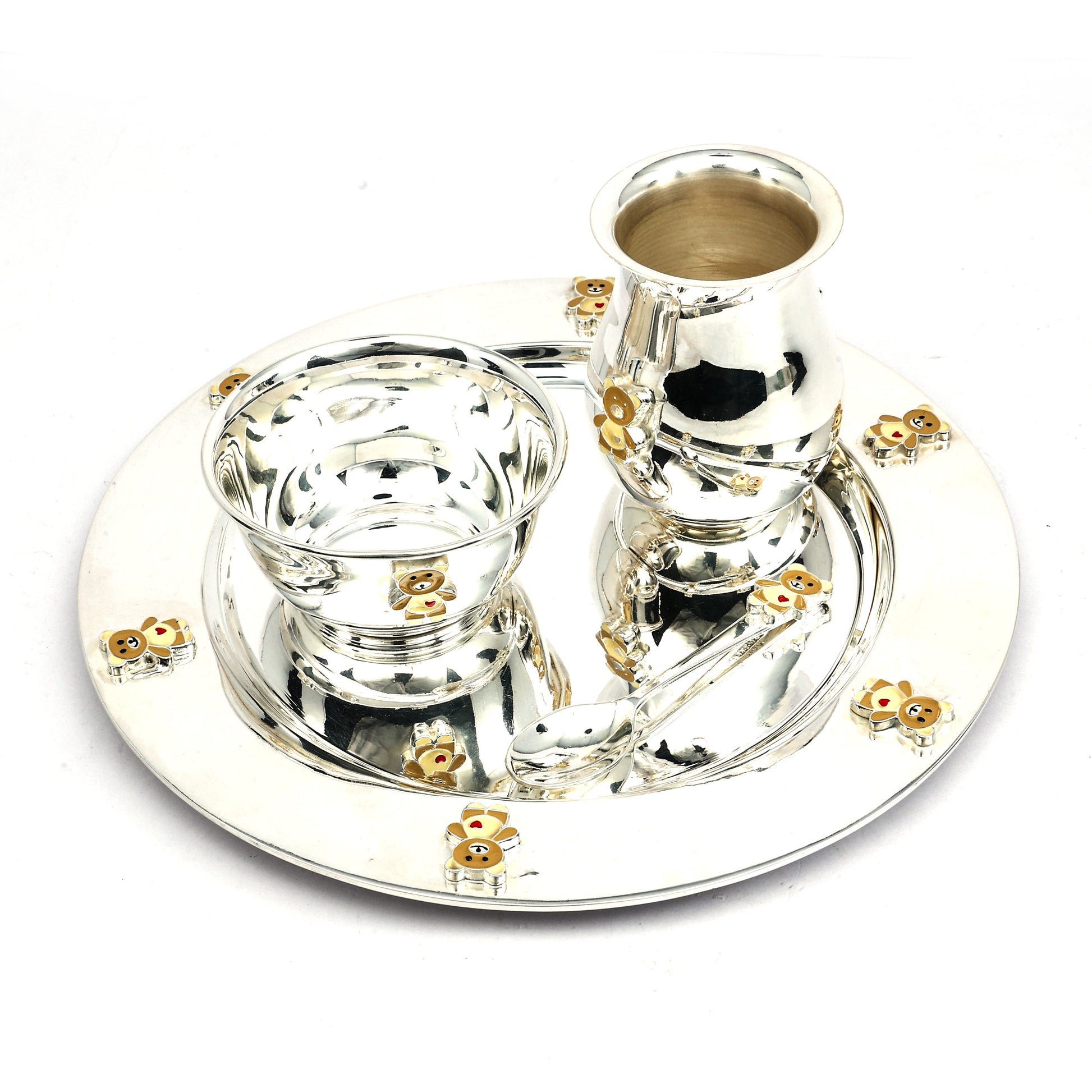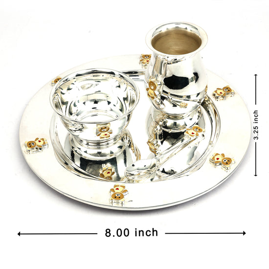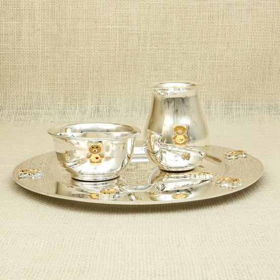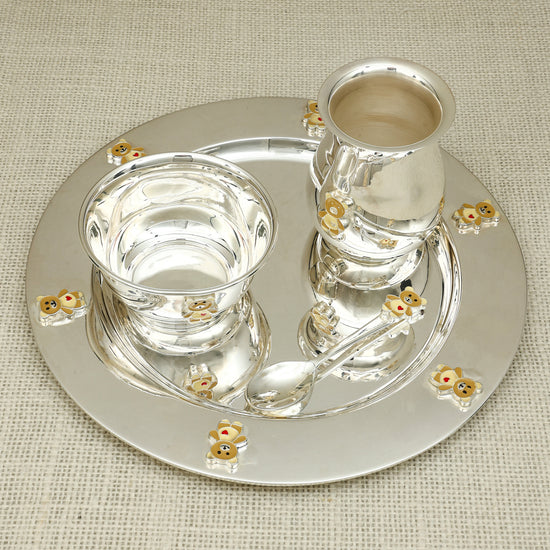 Make every mealtime special for your little one with this adorable silver dinner set featuring a cute teddy bear design. The set includes a round plate, a matching bowl, a cup, and a spoon, all beautifully accented with tiny teddy bear motifs. Crafted from premium-quality silver, this set is safe, durable, and easy to clean. A perfect gift for baby showers, birthdays, or special occasions, adding a touch of charm and elegance to your child’s dining experience!