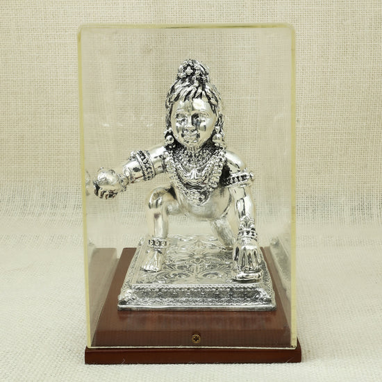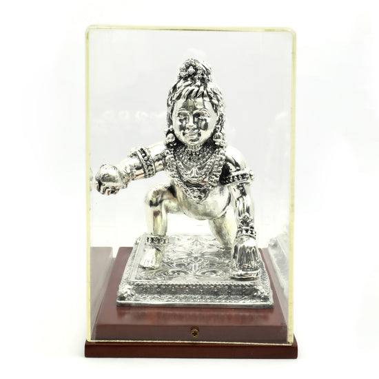 Embrace divine blessings with this beautifully crafted Ladu Gopal idol in antique silver finish, featuring intricate detailing and traditional attire. Seated on an ornate platform and encased in a transparent display box with a polished wooden base, this piece is perfect for pooja rooms, gifting, or festive décor. A symbol of joy and devotion, it makes an ideal present for Janmashtami, housewarmings, or spiritual occasions.