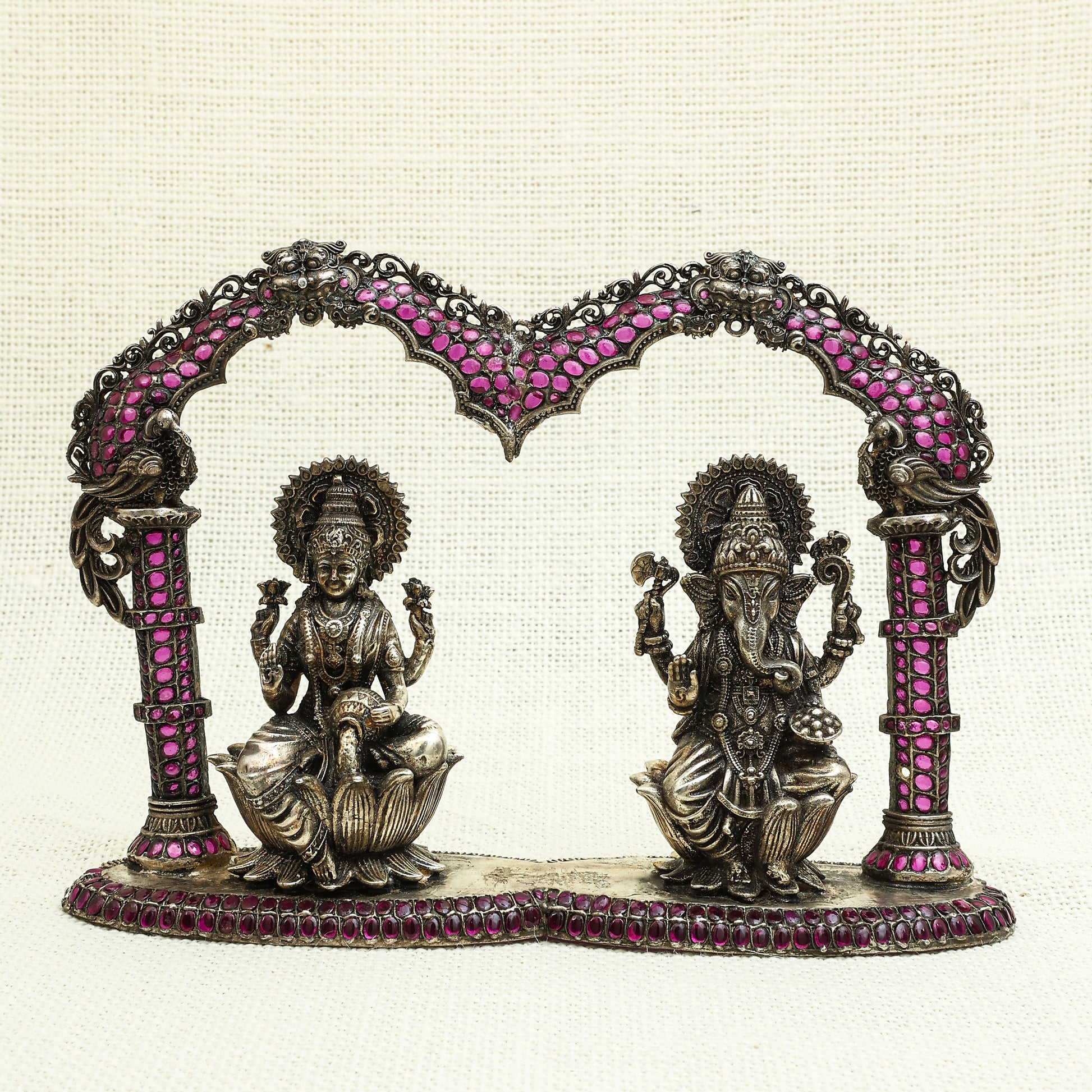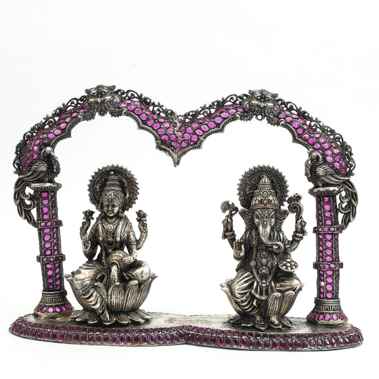 A magnificent silver idol of Goddess Laxmi and Lord Ganesha , seated gracefully beneath a beautifully adorned arch. This intricately handcrafted piece features fine detailing, embellished with vibrant pink and blue stones, along with delicate pearl hangings. The divine presence of Lord Ganesha symbolizes wisdom, prosperity, and good fortune. A perfect addition to pooja rooms, home decor, or as an auspicious gift for weddings and festive occasions.