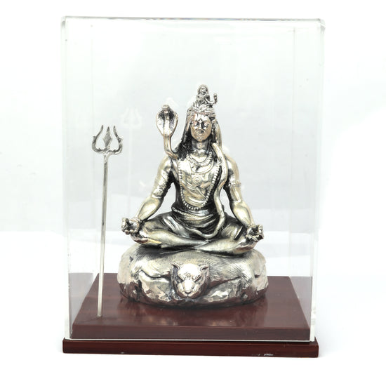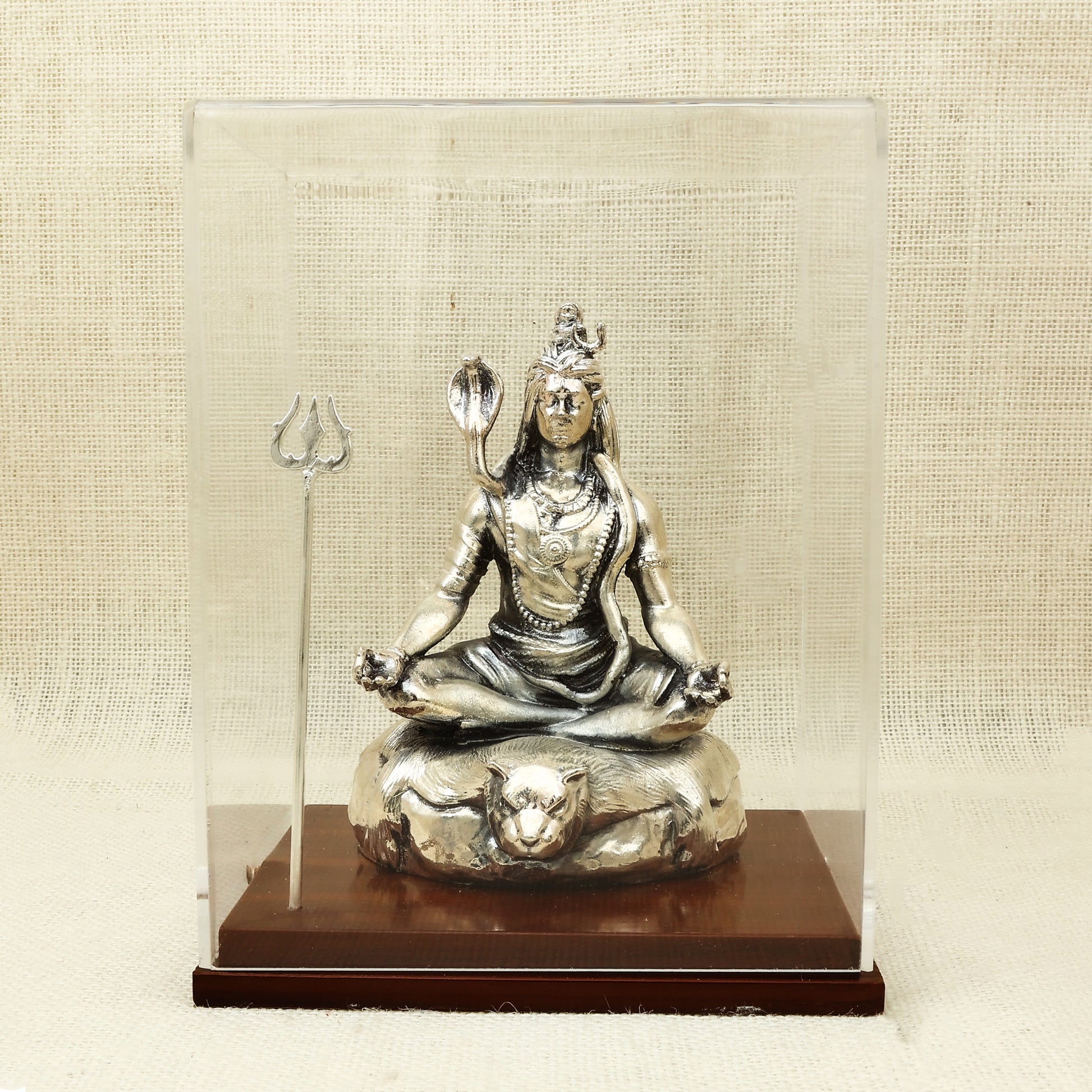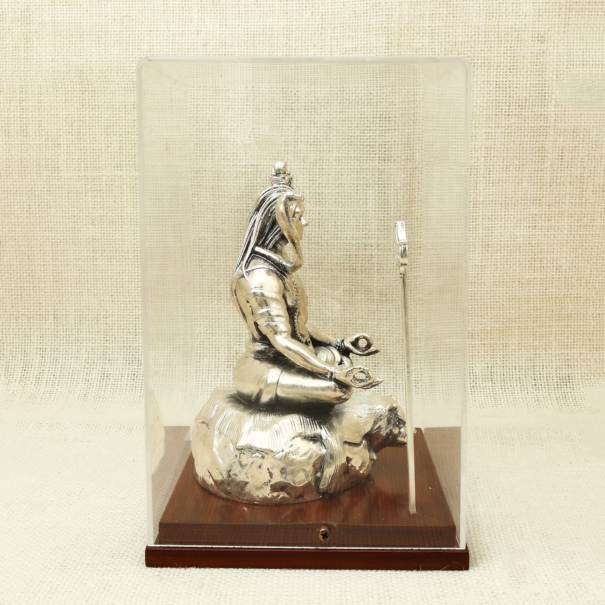 Resin Silver Lord Shiva Idol in Meditative Pose – Trishul Display with Glass Case