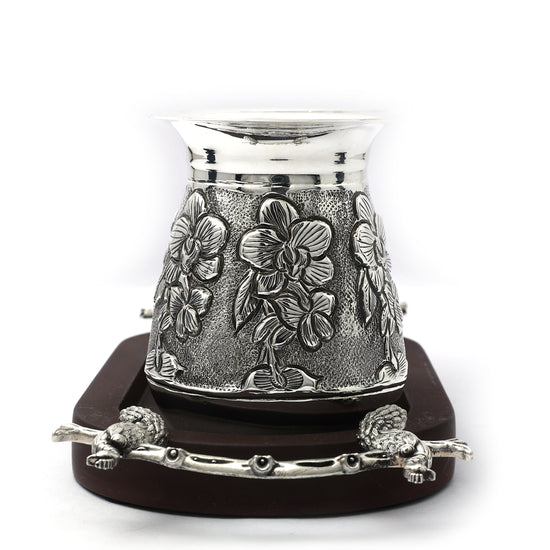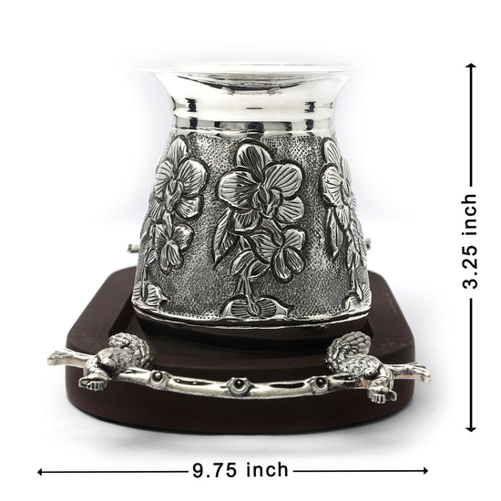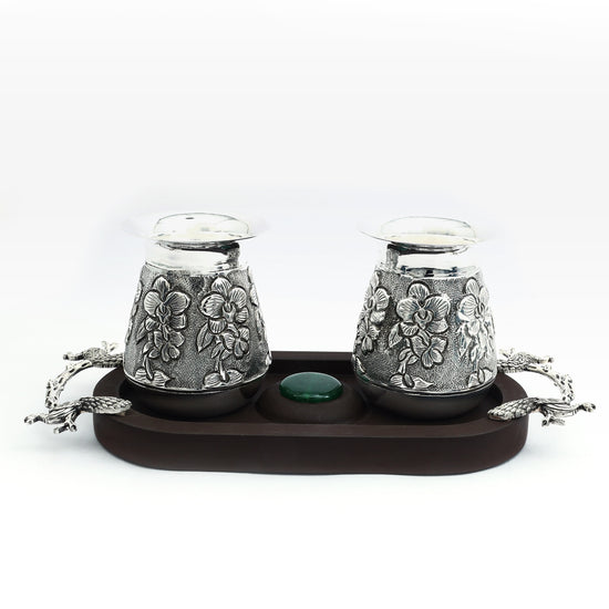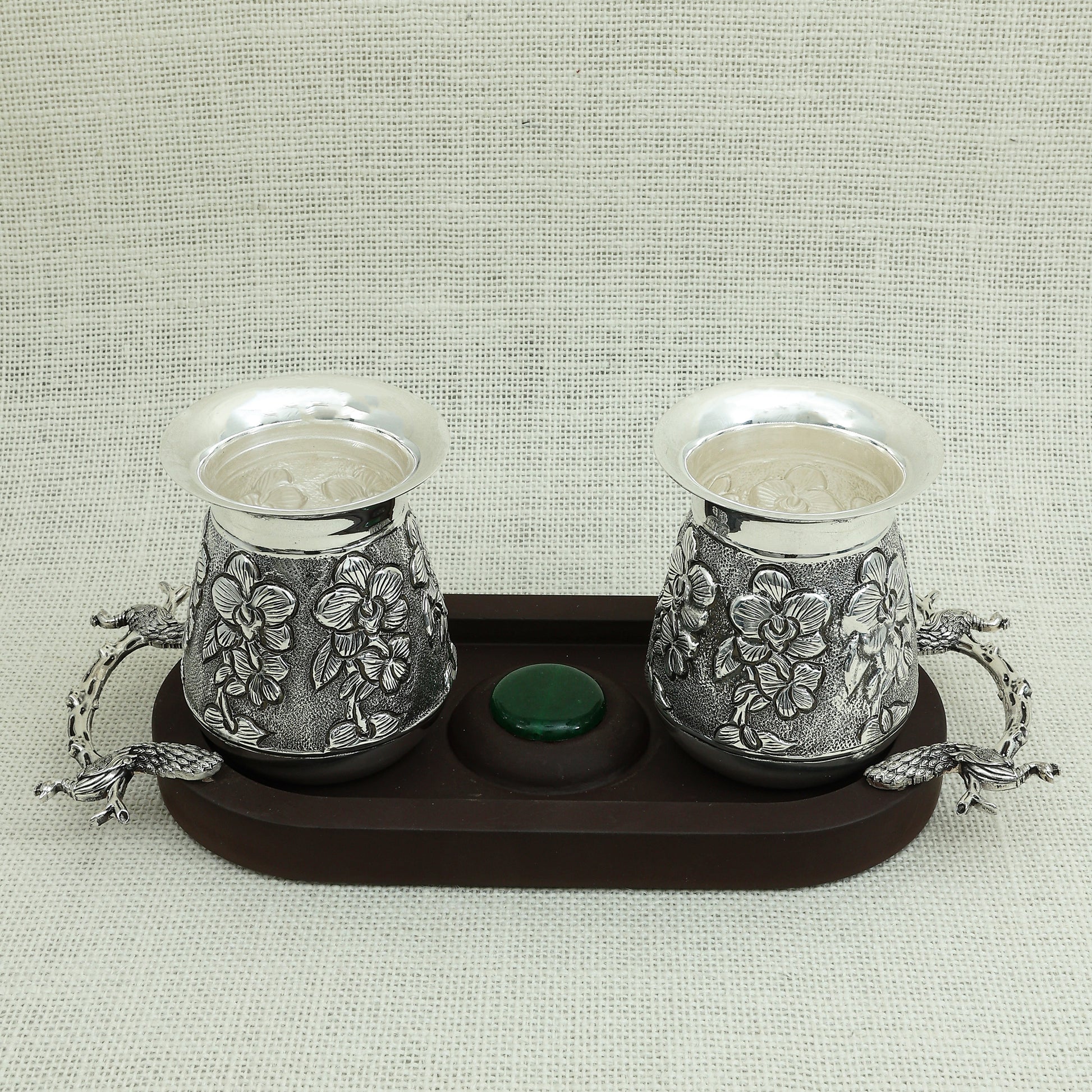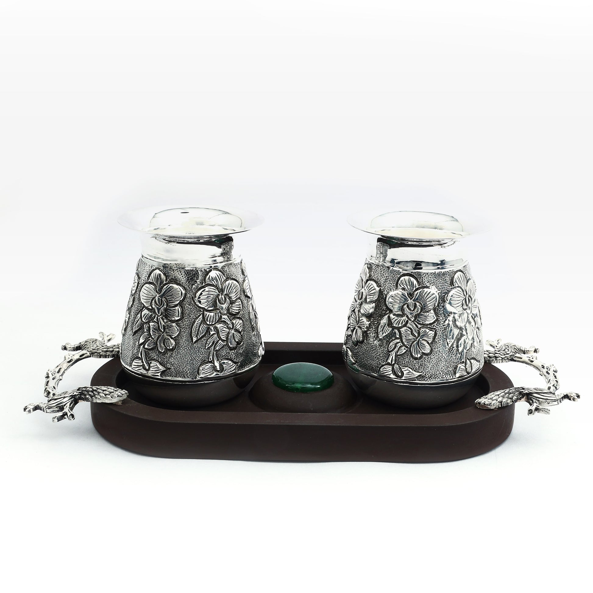 Crafted from silver, this elegant lota set showcases intricate floral engravings, exuding timeless charm. Resting on a beautifully designed wooden tray with dragon handles, it adds a regal touch to any traditional setting. Perfect for pooja rituals or as a luxury gift for special occasions.