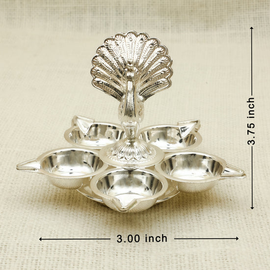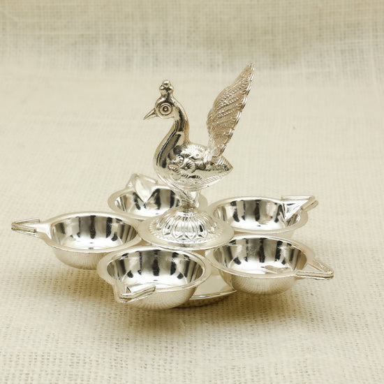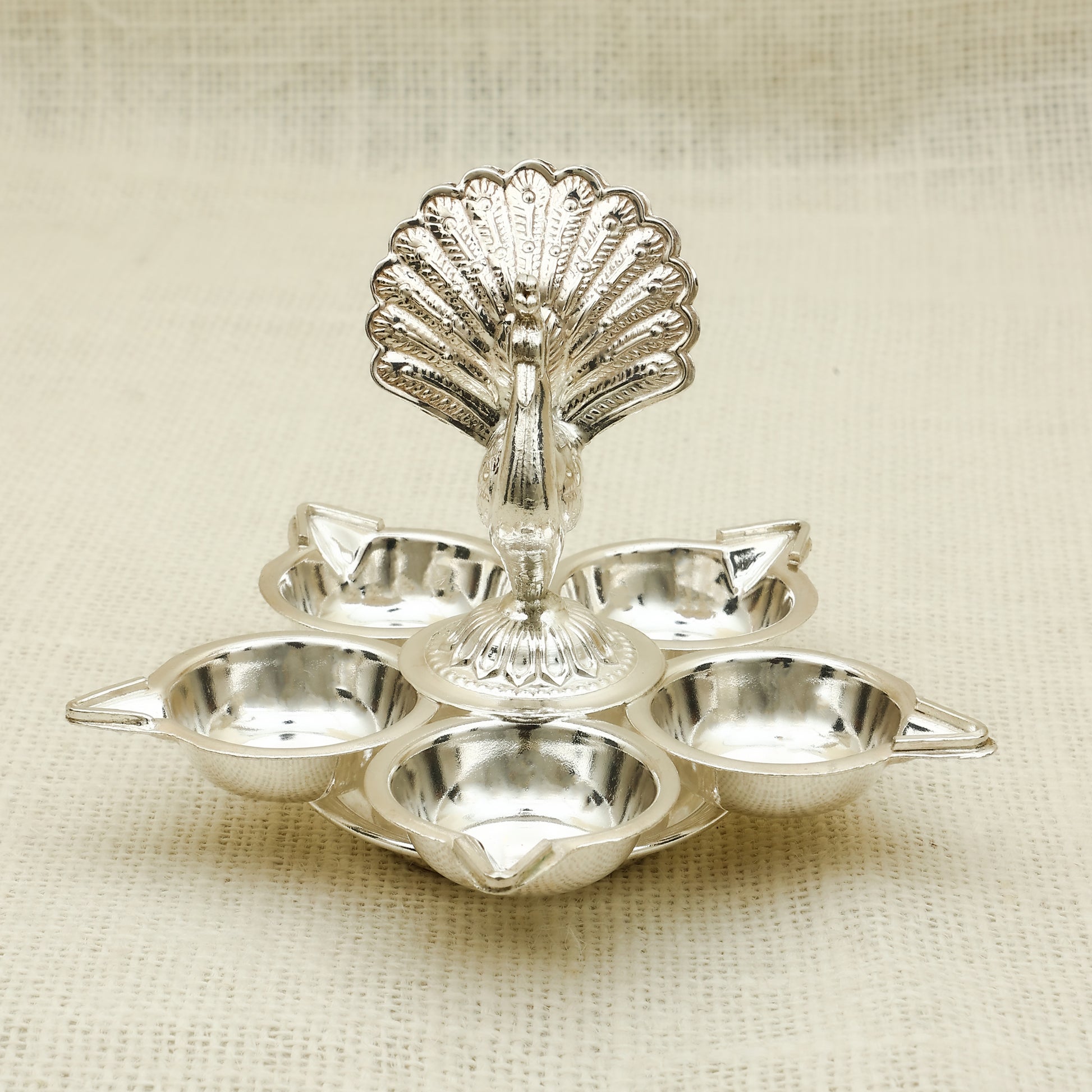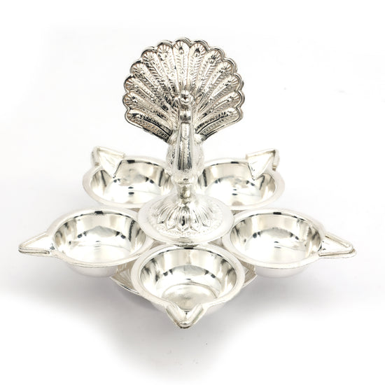 Silver Peacock Diya Stand – 5-Wick Oil Lamp for Pooja