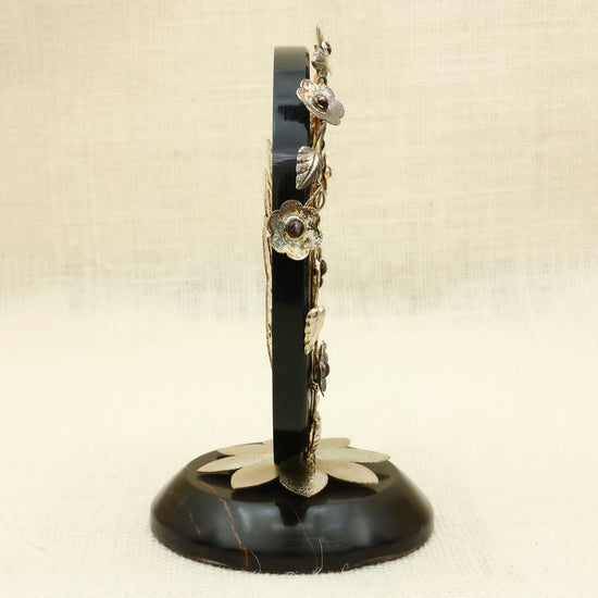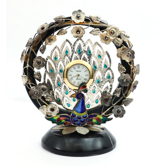 Bring home timeless charm with this handcrafted silver peacock table clock. Set within an intricately designed floral wreath and framed by a stunning peacock motif with vibrant enamel detailing, the clock adds both utility and artistry to your space. The delicate silver feather backdrop with turquoise accents enhances its elegance, making it an ideal centerpiece for living rooms, desks, or festive décor. A beautiful gift choice for anniversaries, housewarmings, or special celebrations.