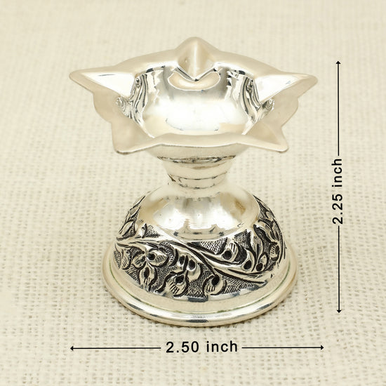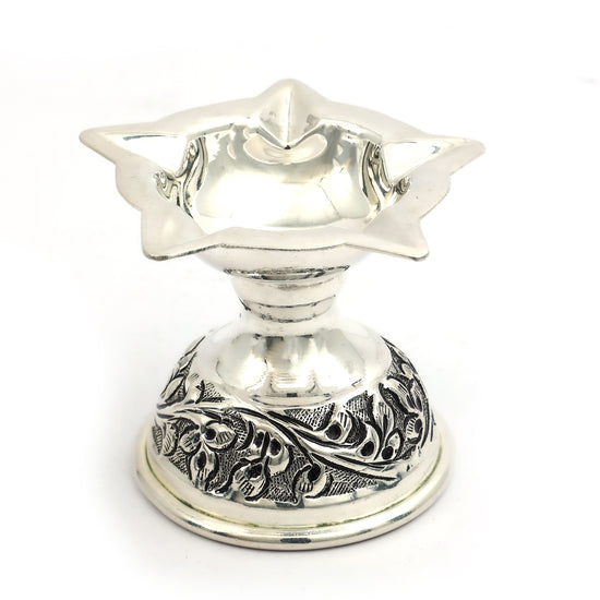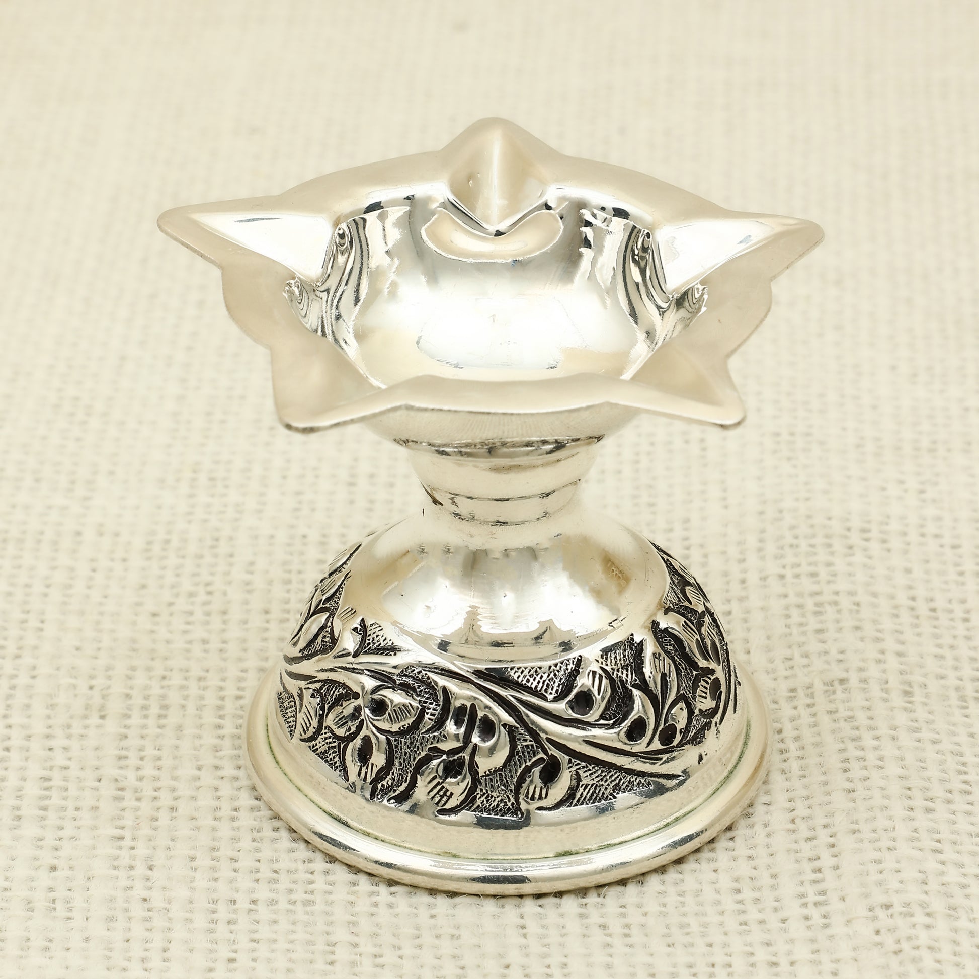 Illuminate your spiritual space with this elegant silver plated diya, featuring a beautifully contoured bowl and an intricately engraved floral base. Designed for daily rituals and festive occasions, its sturdy build and timeless shine make it a perfect addition to your pooja setup or a thoughtful gift for Diwali, housewarmings, and sacred ceremonies.