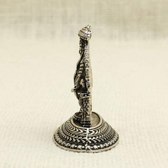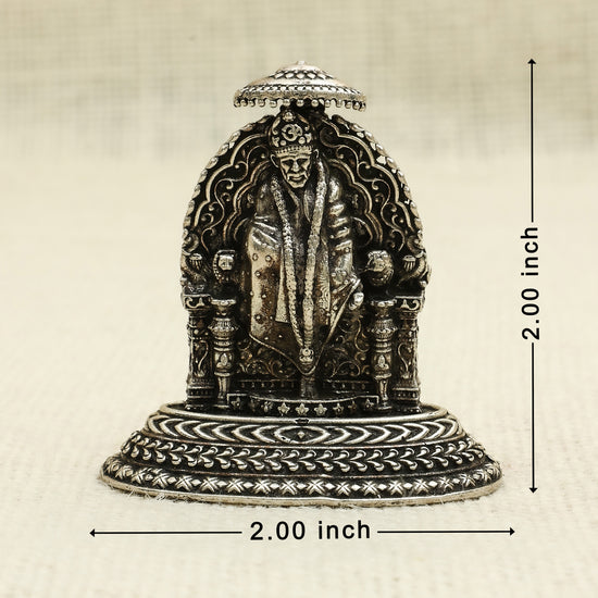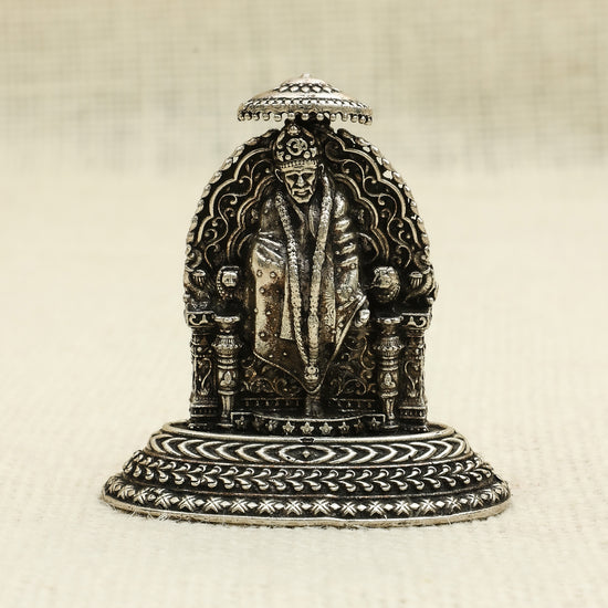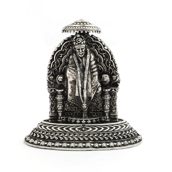 Invoke blessings and serenity with this finely crafted silver idol of Sai Baba, seated in his iconic pose under a traditional umbrella. Detailed carvings on the throne and arch add to its sacred appeal, making it a graceful addition to your pooja room or altar. An ideal gift for spiritual milestones, religious functions, or for offering devotion and gratitude in your daily worship.