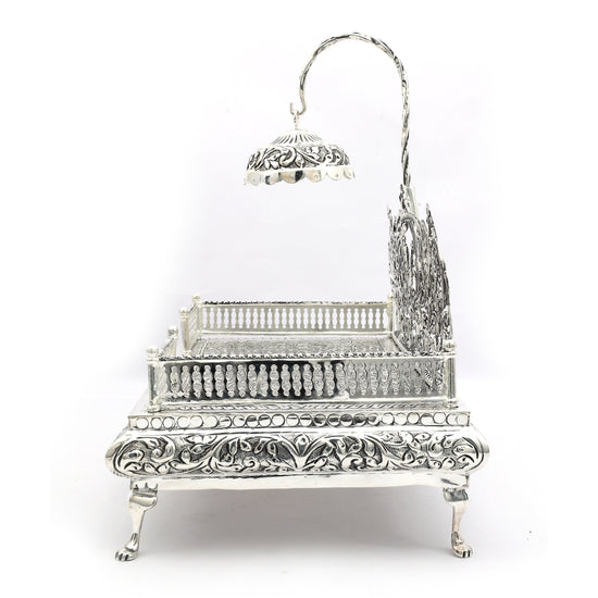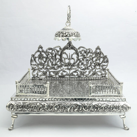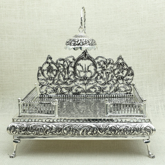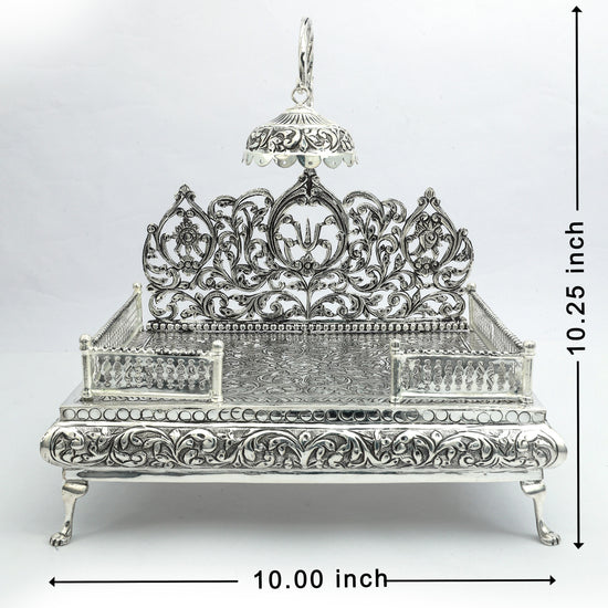 This beautifully handcrafted Silver Singhasan (throne) features a traditional design with an antique silver finish, perfect for seating small deities during daily pooja or festive rituals. Intricate carvings on the backrest and base reflect royal elegance and devotional artistry, while its sturdy platform provides a respectful pedestal for idols. Ideal for use in home temples, mandirs, or during special occasions like Janmashtami and Navratri, this Singhasan adds grace and sanctity to any sacred setup.