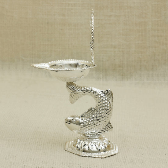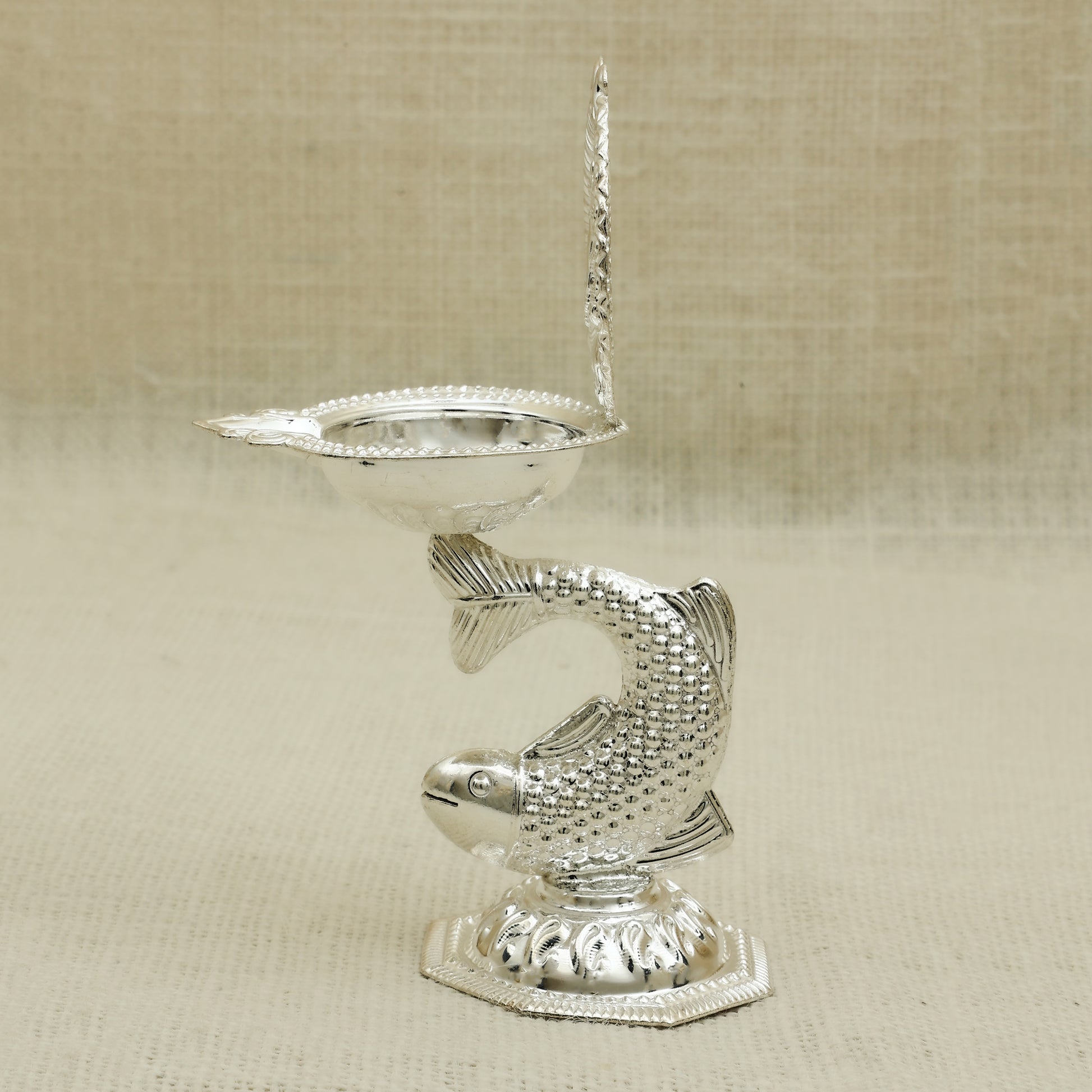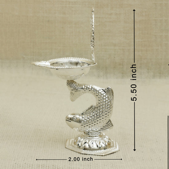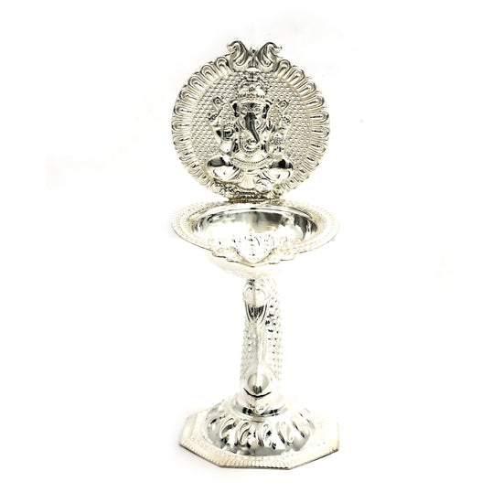 Grace your pooja space with this elegant silver plated standing diya, featuring a beautifully embossed backplate of Goddess Lakshmi and Lord Ganesha. The elevated pedestal design and detailed craftsmanship enhance its traditional appeal, making it ideal for festive rituals, daily worship, or as a divine gift for spiritual occasions and housewarmings.