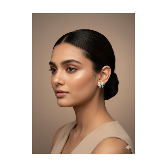 The TARAVA Sparkling Bow Drop Silver Earrings showcase an elegant bow motif symbolizing grace and femininity. Accented with shimmering cubic zirconia and subtle drop detailing, this design creates a beautiful play of light with every movement. Sophisticated yet playful, these earrings are perfect for festive occasions, parties, and refined evening looks.