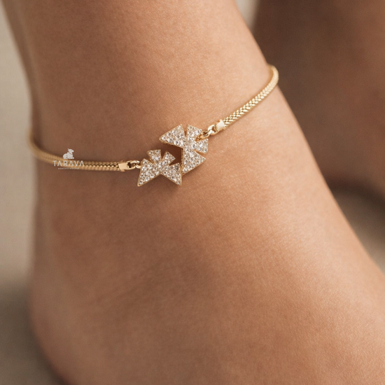 Soft, graceful, and eye-catching, the TARAVA Twin Butterfly Sparkle Anklet celebrates beauty and movement through its twin butterfly design. The shimmering stone accents add a gentle glow, making this piece perfect for adding elegance to both everyday and special looks.